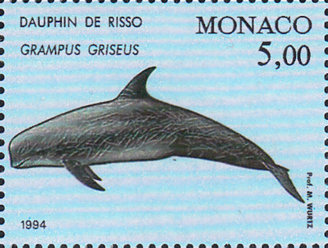 Auf dieser Marke aus Monaco (MiNr 2170) wird ein Rundkopfdelfin (Grampus griseus) gezeigt.