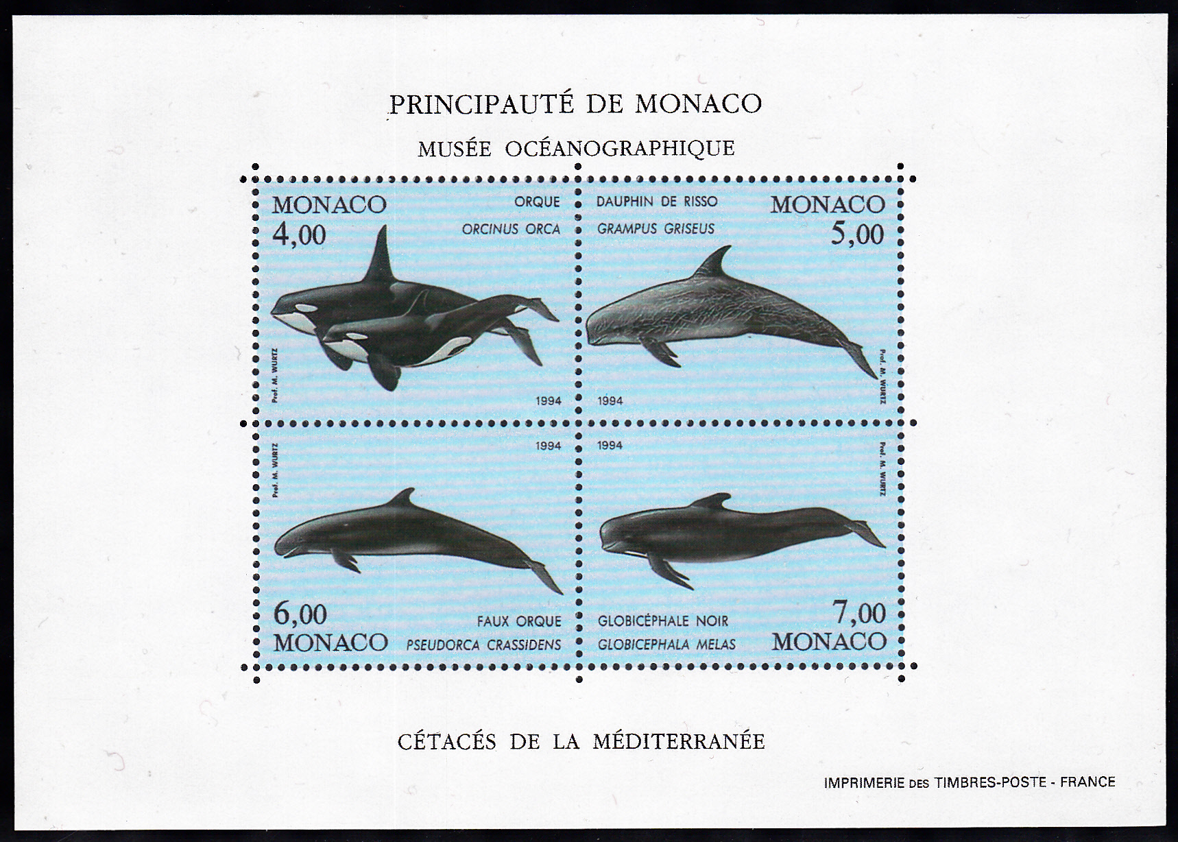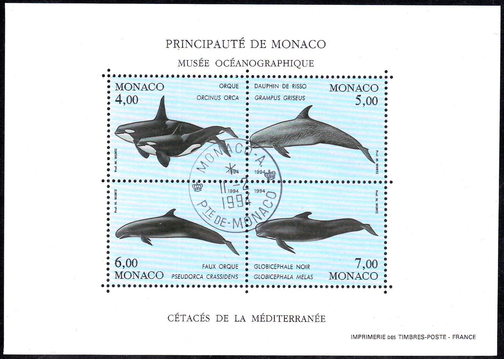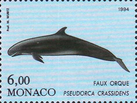 Hier eine Marke aus Monaco (MiNr 2171) mit einem Kleine Schwertwal (Pseudorca crassidens).