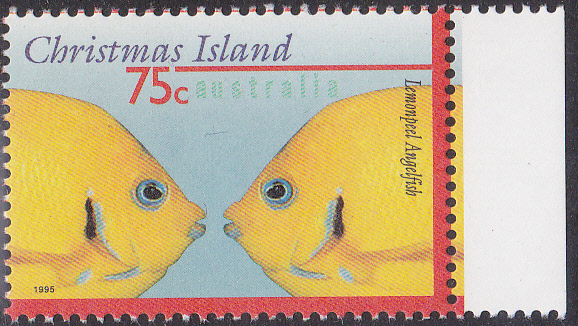 Diese Marke der Weihnachtsinsel (MiNr 413) zeigt zwei Zitronen-Zwergkaiserfische.