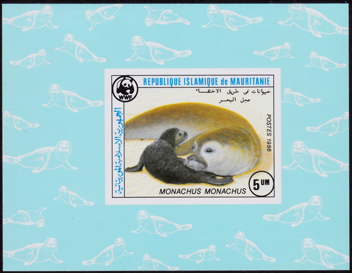 In Mauritanien ist eine Serie "Weltweiter Naturschutz" mit Abbildungen zur Mittelmeer-Mönchsrobbe (Monachus monachus) erschienen. Hier zeige ich einen sogenannte "Epreuves de Luxe" (Es handelt sich dabei typischerweise um ungezähnte Einzelblocks ohne aufwendige Randgestaltung) der Marke MiNr 871 mit zwei Mittelmeer-Mönchsrobbe (Monachus monachus) im Wasser.