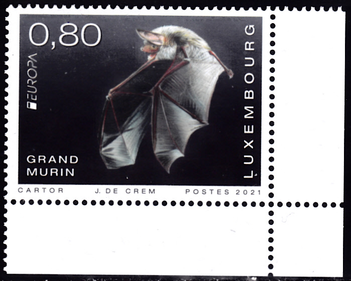 Die Europamarken 2021 zum Gemeinschaftsthema "Gefährdete Wildtiere" sind in Luxemburg am 11. Mai 2021 erschienen. Diese Marke zu 0,80€ zeigt ein Großes Mausohr (Myotis myotis).
