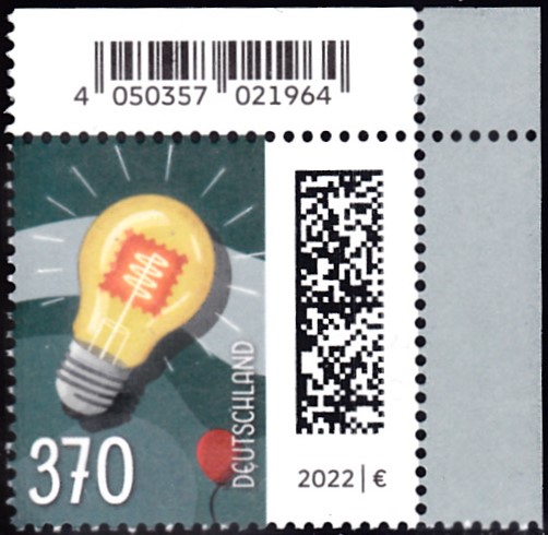 Am 1.9.2022 ist die nassklebende Marke zu 370 Cent (MiNr 3715) aus der Dauerserie "Welt der Briefe" erschienen. Sie hat das Motiv "Glühbirne mit Leuchtmarke, Luftballon".