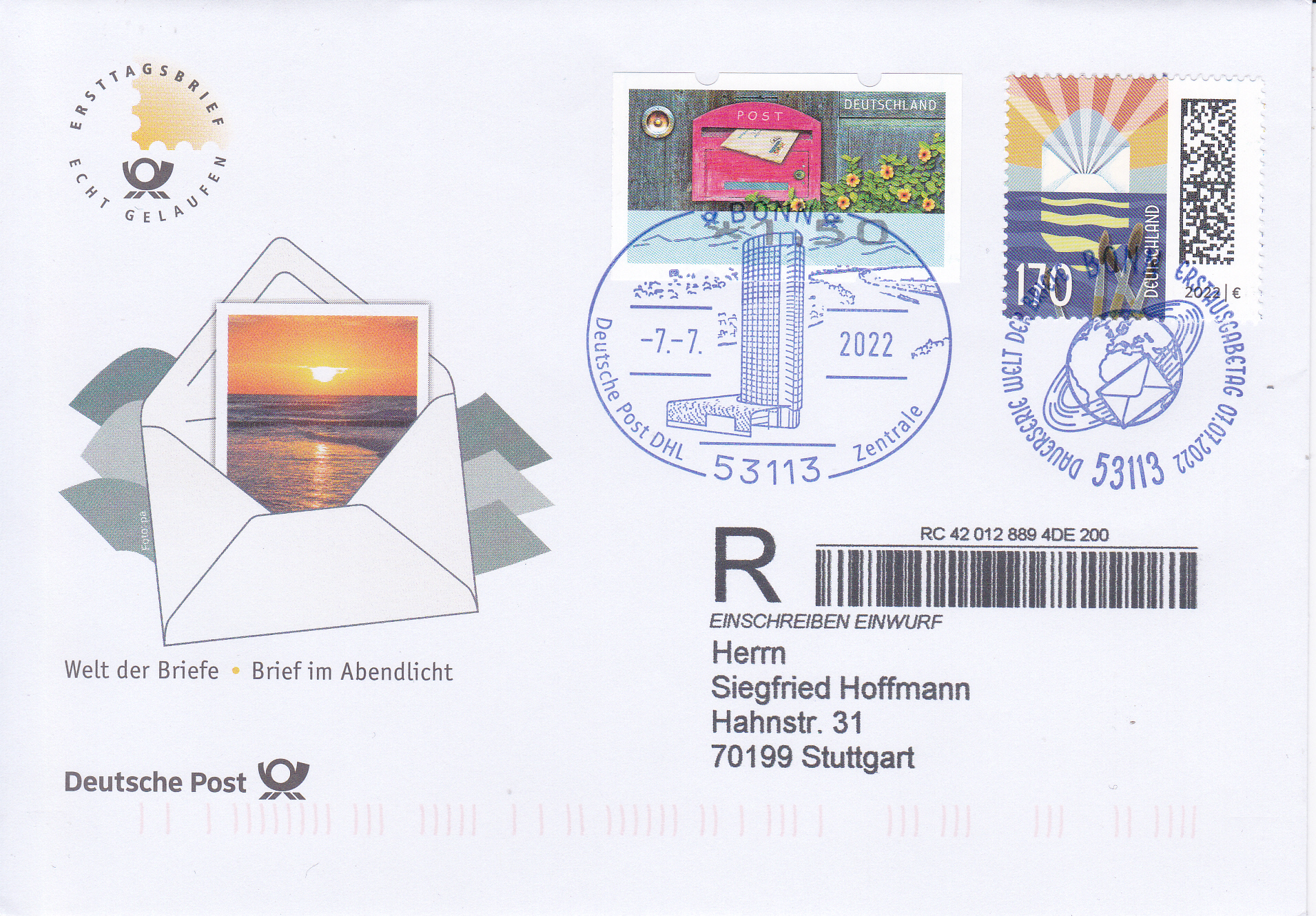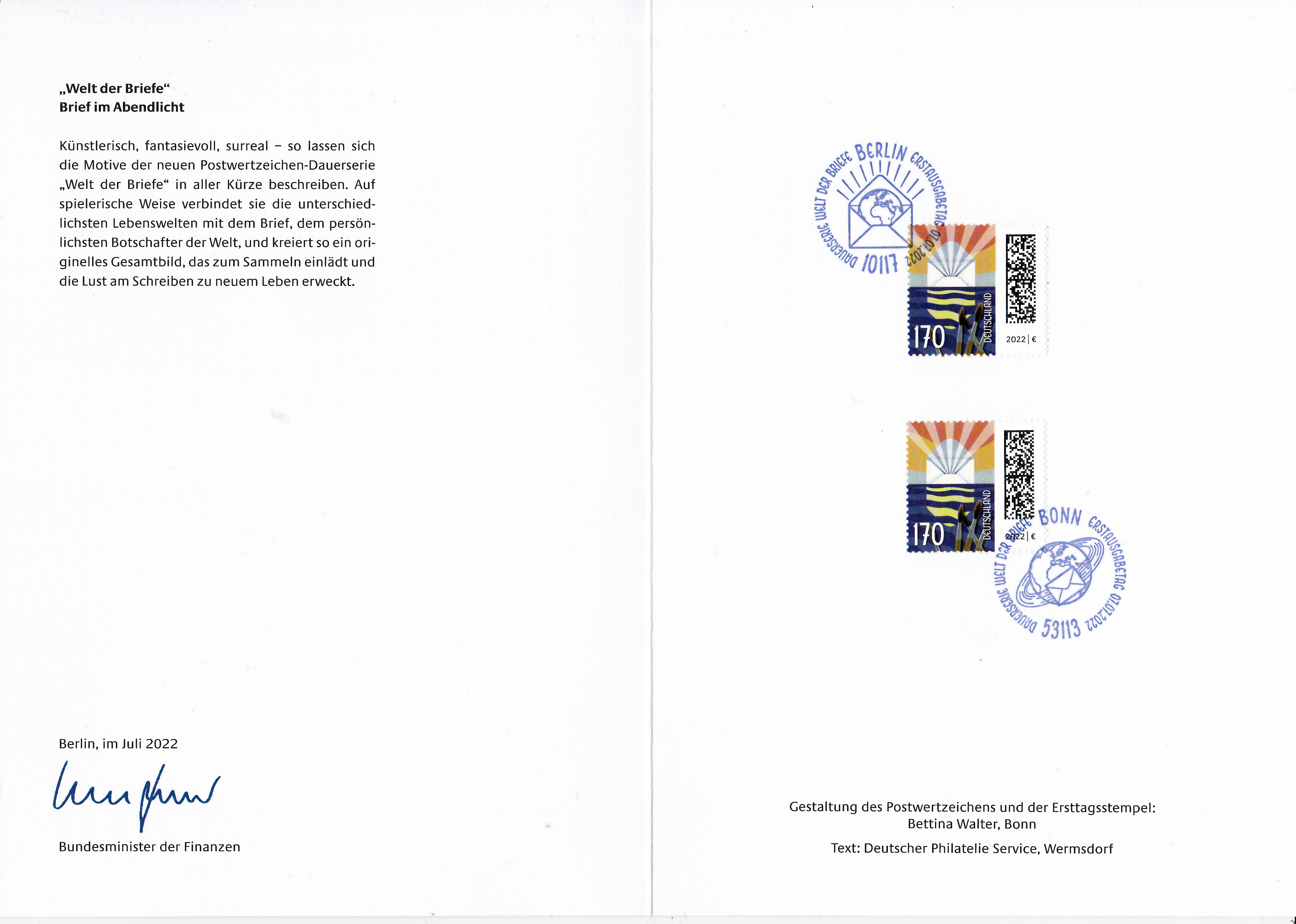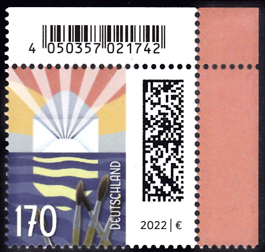 Am 7.7.2022 ist die nassklebende Marke zu 170 Cent (MiNr 3695) aus der Dauerserie "Welt der Briefe" erschienen. Sie zeigt einen "Brief und Pinsel im Abendlicht".