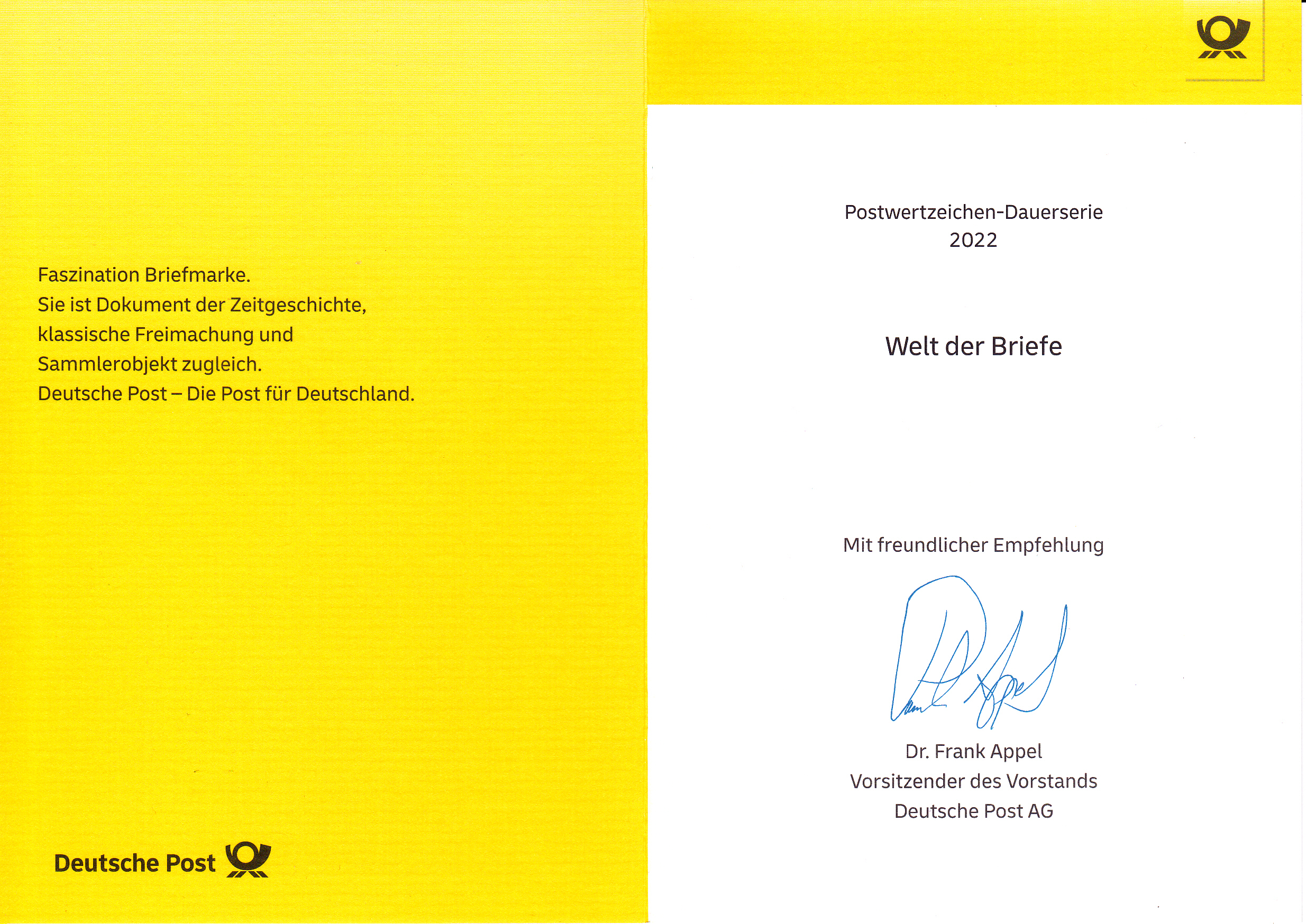Klappkarte des Vorstandsvorsitzenden der Deutschen Post AG mit der Marke zu 170Cent (MiNr 3695) aus der Freimarkenserie "Welt der Briefe" und dem Ersttagsonderstempel Bonn.
