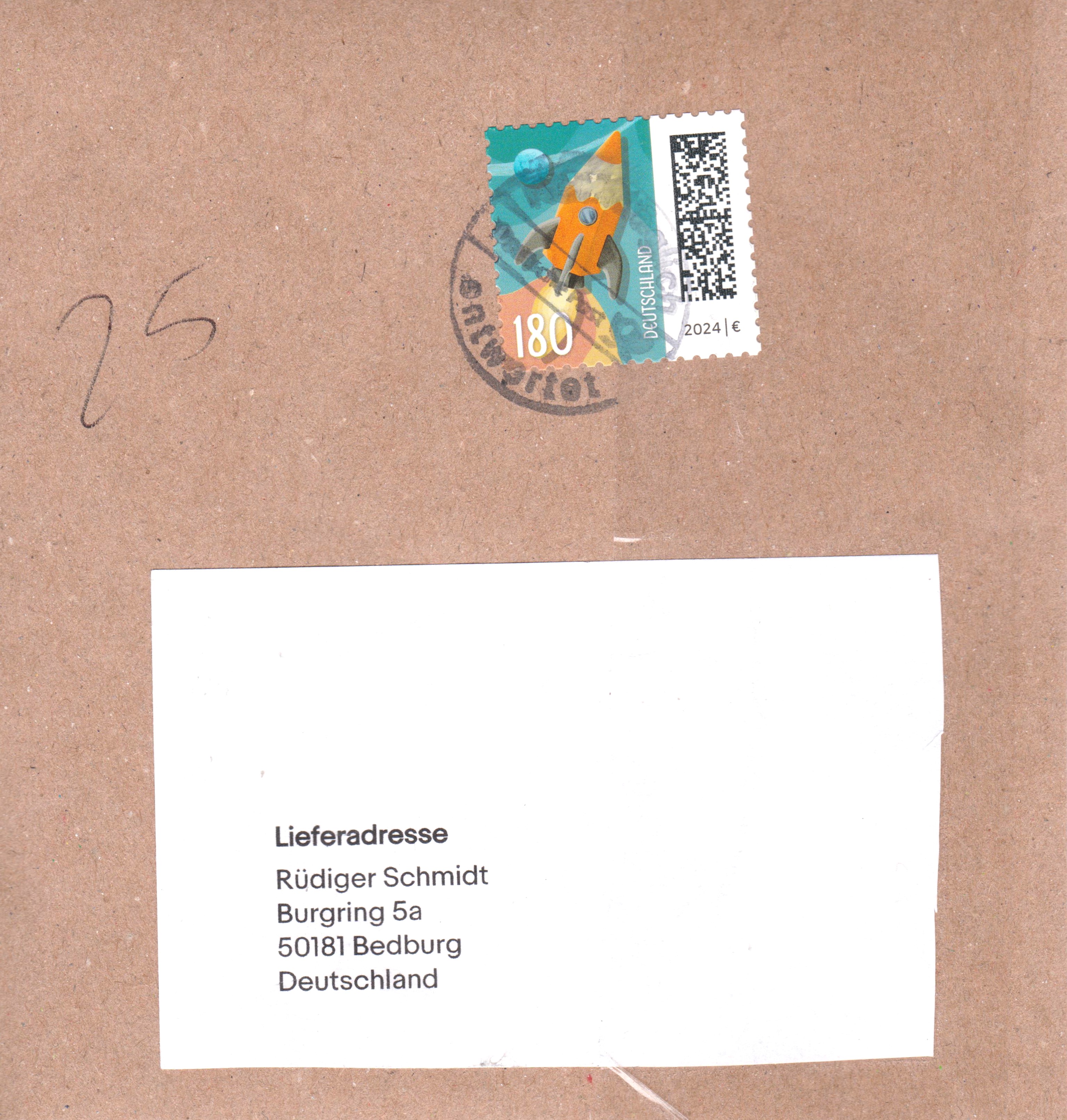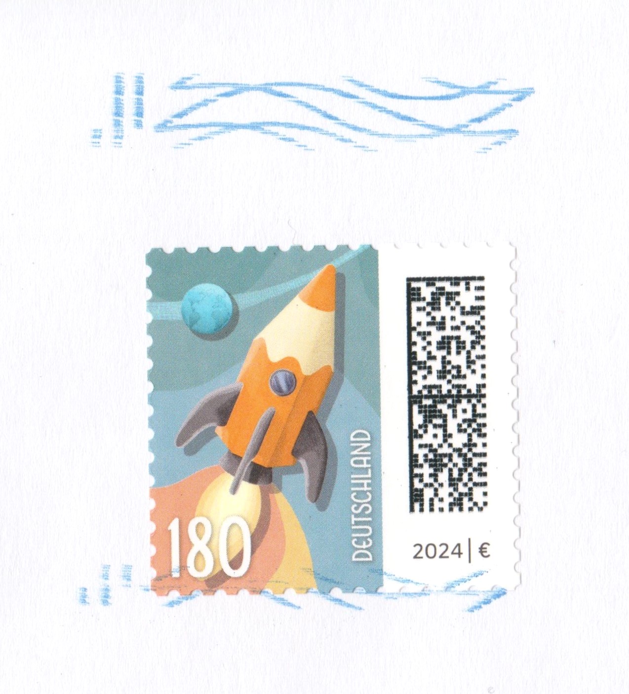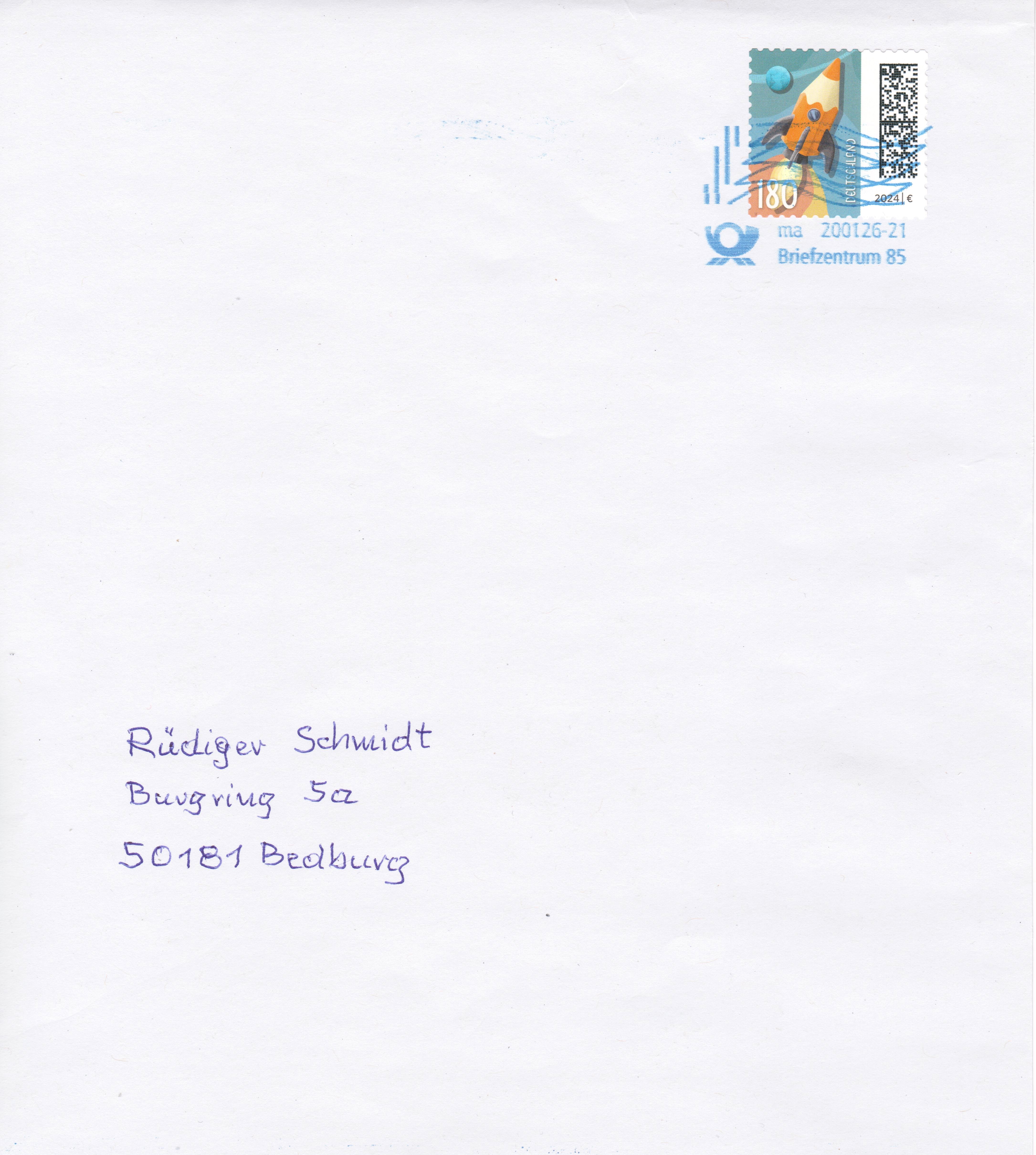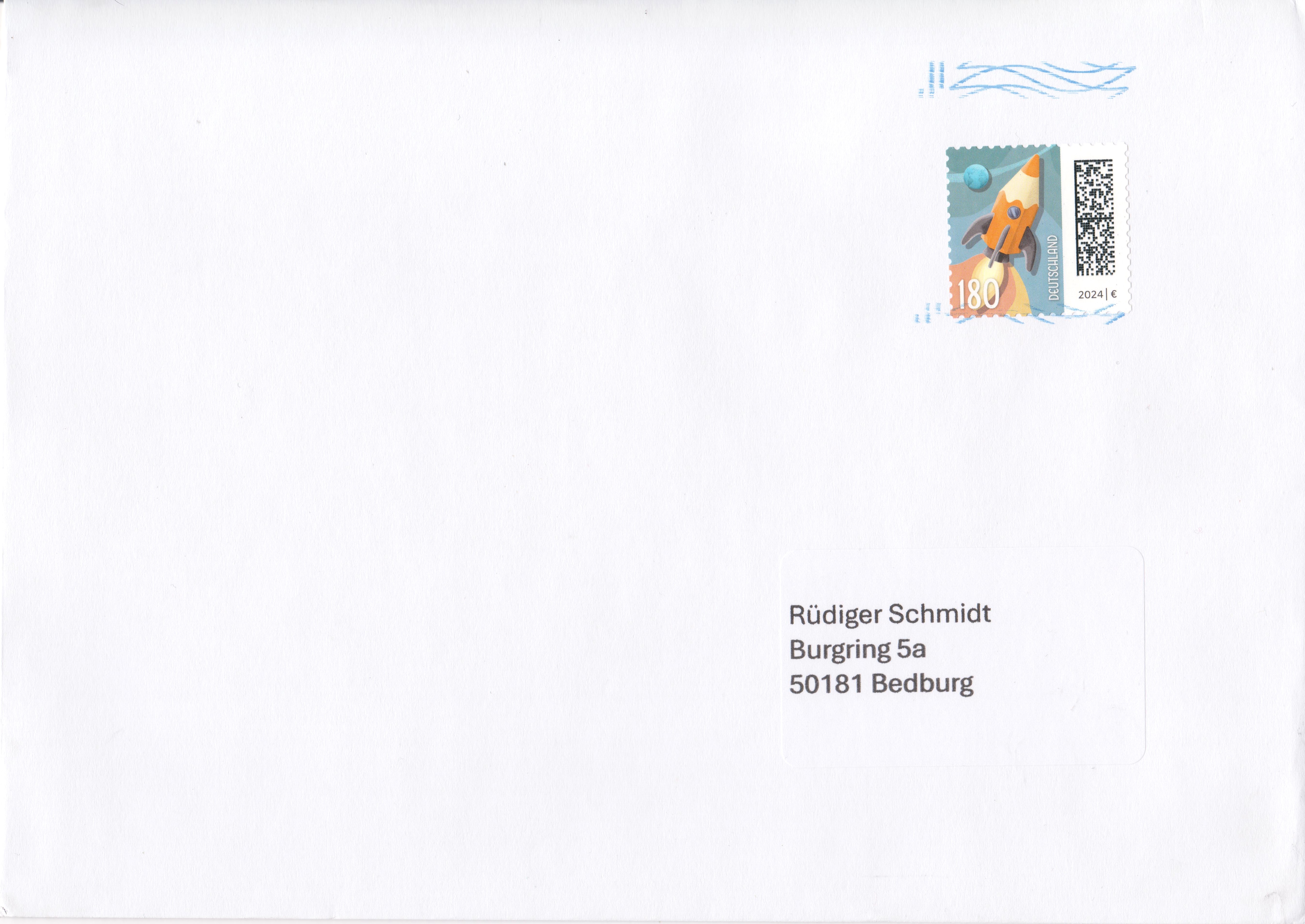 Klappkarte des Vorstandsvorsitzenden der Deutschen Post AG mit der Marke (MiNr 3870) zu 180 Cent mit dem Motiv "Buntstift als Rakete vor Erdball" aus der Dauerserie "Welt der Briefe" und dem Ersttagsonderstempel Bonn.