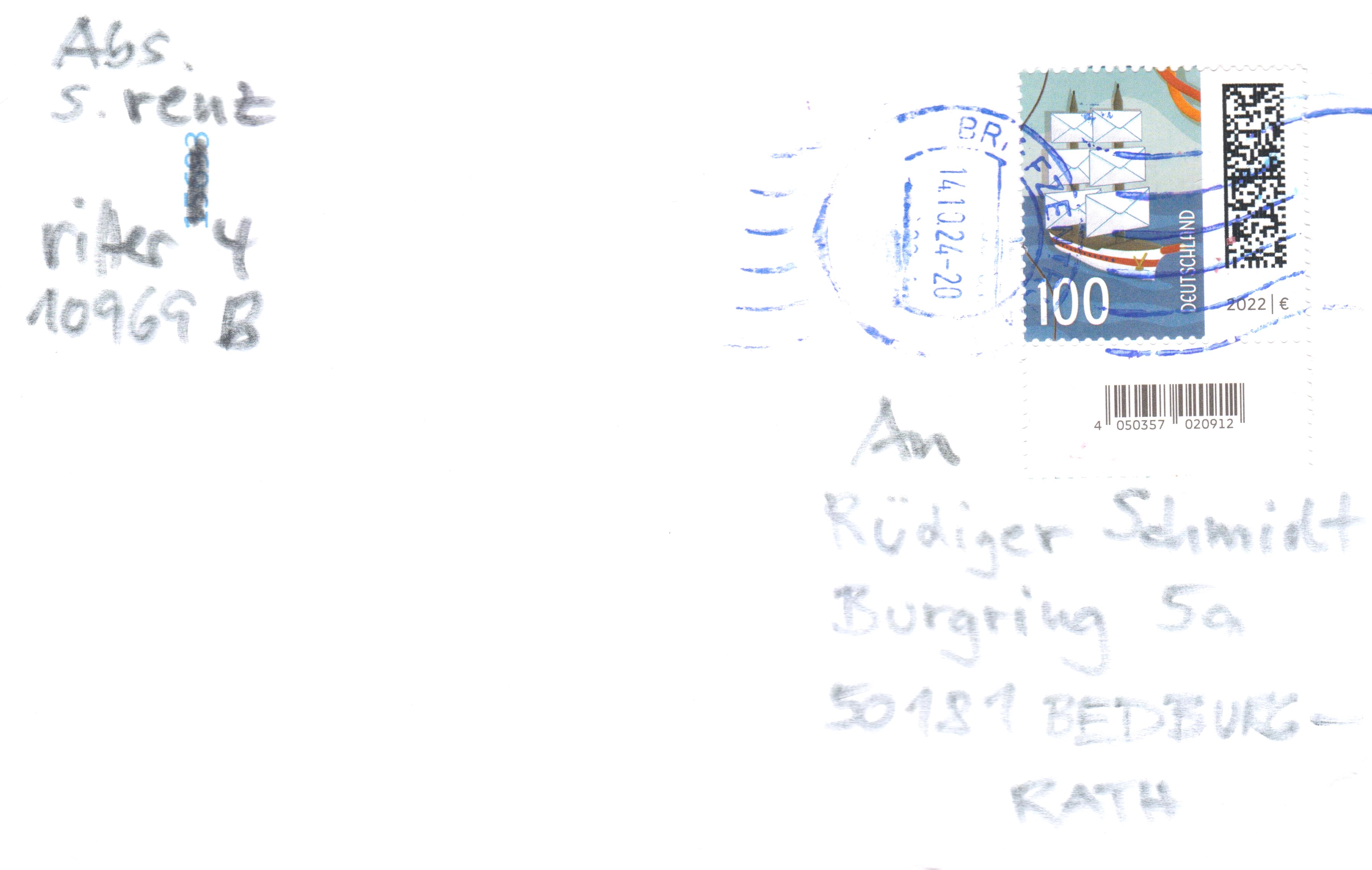Mischfrankatur 100 Cent im Januar 2025 als Portostufe 110 Cent portogerecht als Kompaktbrief, echt gelaufen ab Briefzentrum 67: