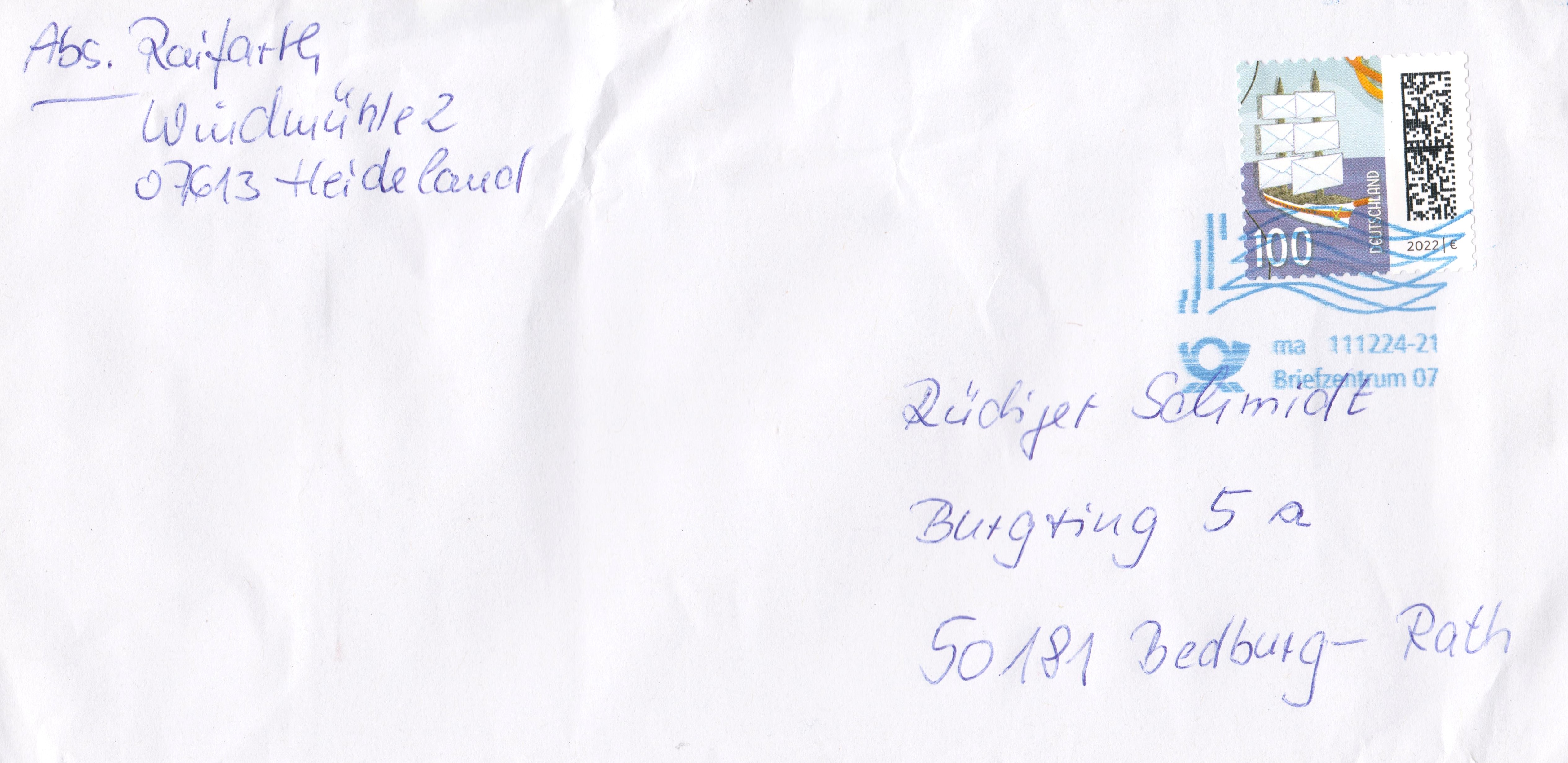 Einzelfrankatur 100 Cent am 11.12.2024 portogerecht auf Kompaktbrief, echt gelaufen ab Briefzentrum 07: