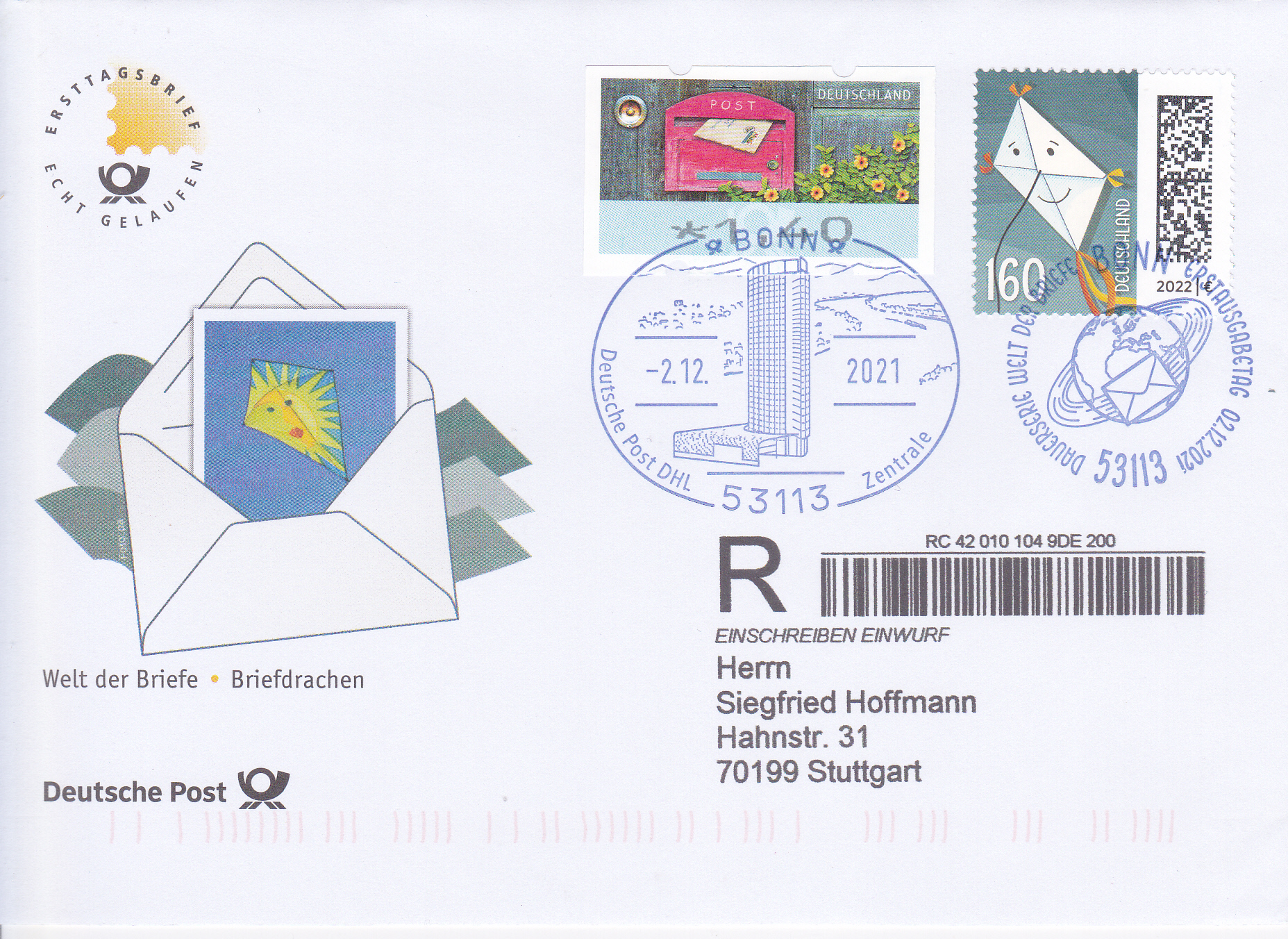 Bei den nassklebenden Marken wurde bei allen Marken dieser Serie der gleiche Ersttagsstempel in Bonn eingesetzt. Hier zeige ich einen Brief mit Einschreiben Einwurf mit der Marke zu 160 Cent und dem ESST Bonn. Die Zusatzfrankatur zu 1,40 € wurde mit dem Stempel der Deutschen Post DHL Zentrale Bonn entwertet. Der "Einschreibezettel" wurde bei diesem Brief (ein Ersttagabrief aus dem Abo der Deutschen Post) beim Adressieren direkt aufgedruckt.