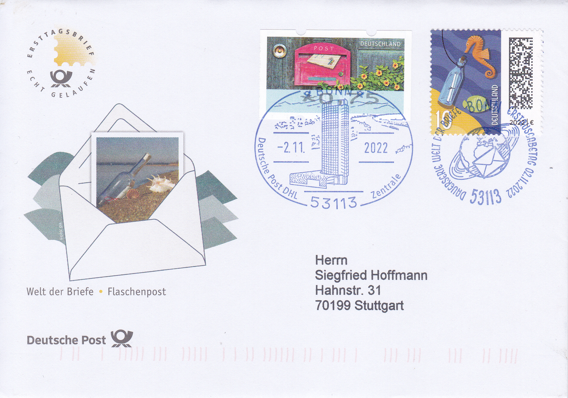 Ersttagsbrief der Deutschen Post (wurde im Abo bei der Post bezogen) mit einer nassklebenden Marke zu 10 Cent mit dem Ersttagstempel Bonn und der Zusatzfrankatur einer Automatenmarke zu 75 Cent mit einem Stempel der Deutschen Post DHL Zentrale in Bonn.