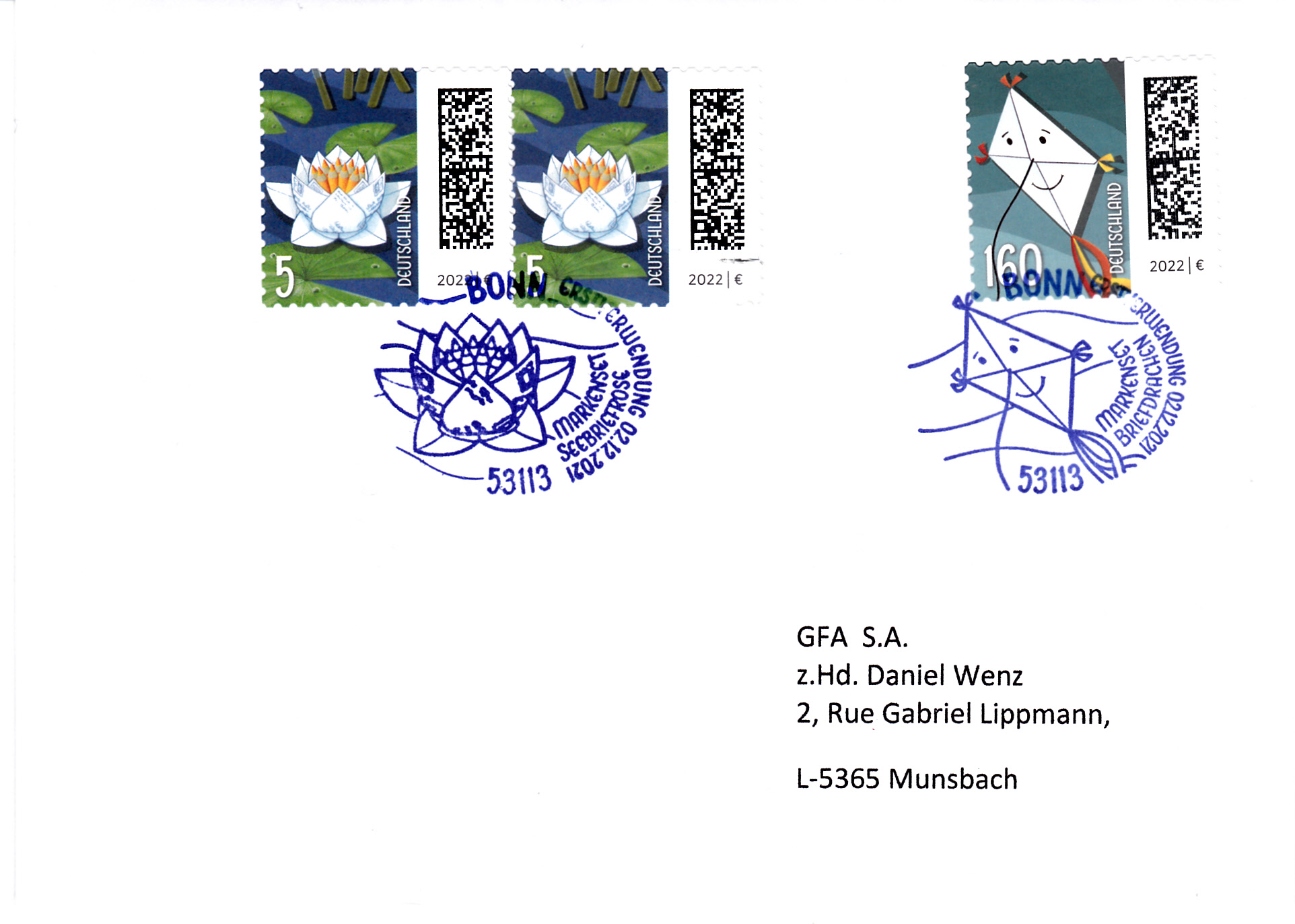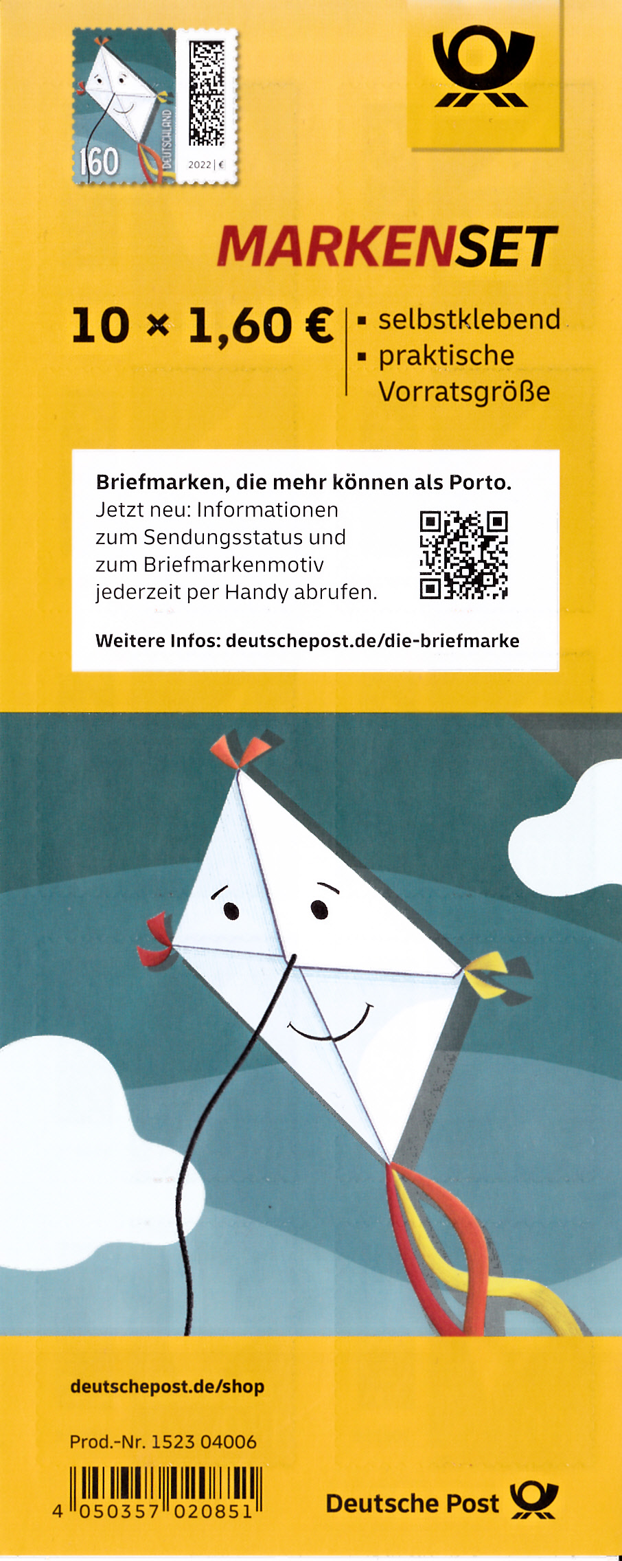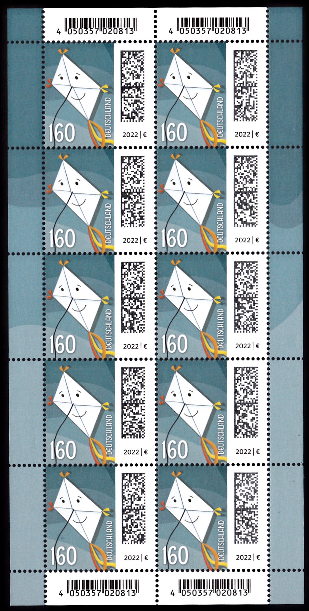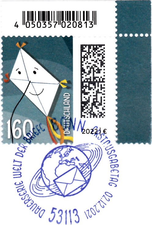 Am 2.12.2021 ist die nassklebende Marke zu 160 Cent (MiNr 3647) aus der Dauerserie "Welt der Briefe" erschienen. Sie zeigt eine "Briefdrachen". Obwohl schon 2021 erschienen wird am Unterrand der Marke das "Ausgabejahr" mit "2022" angegeben.