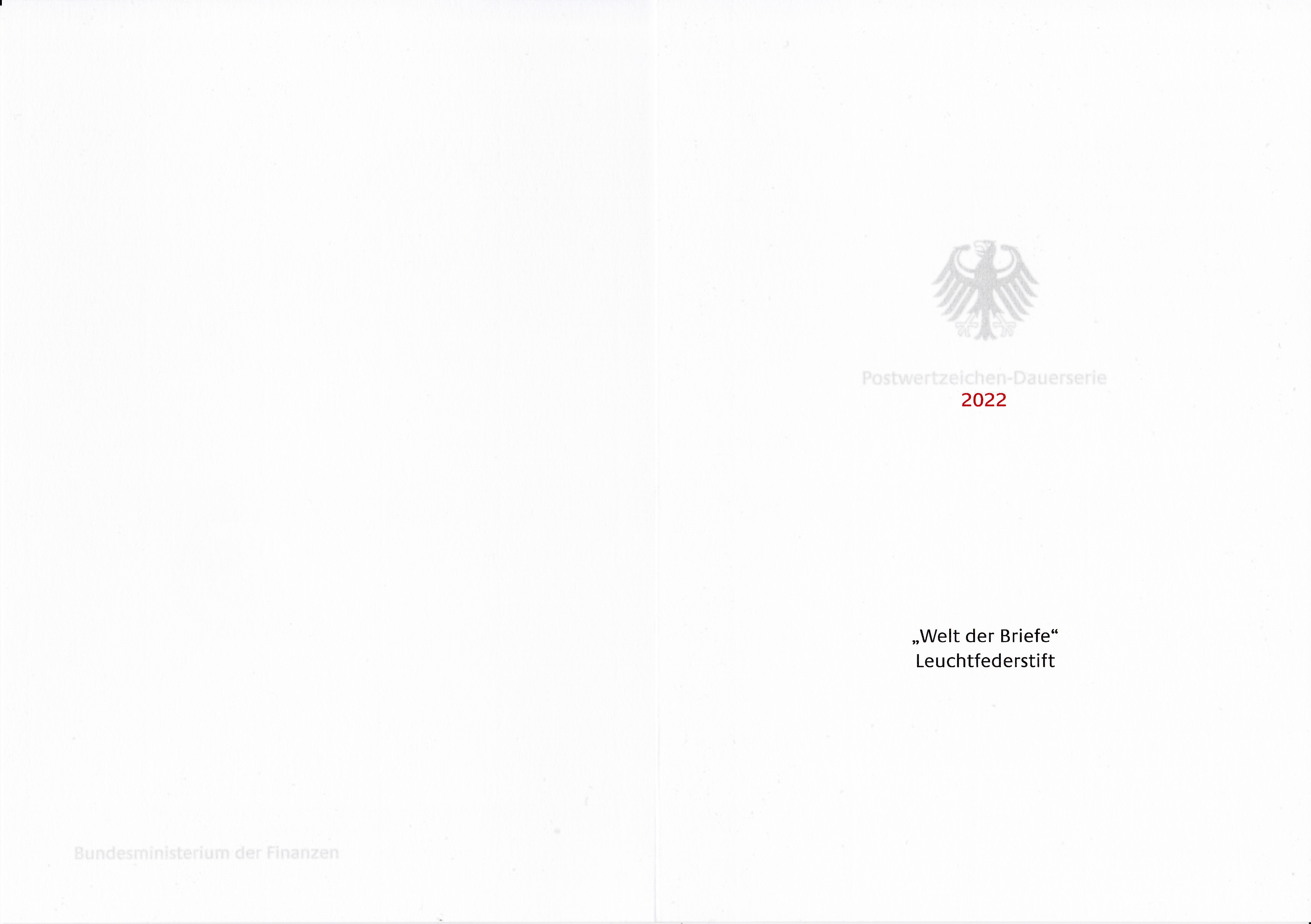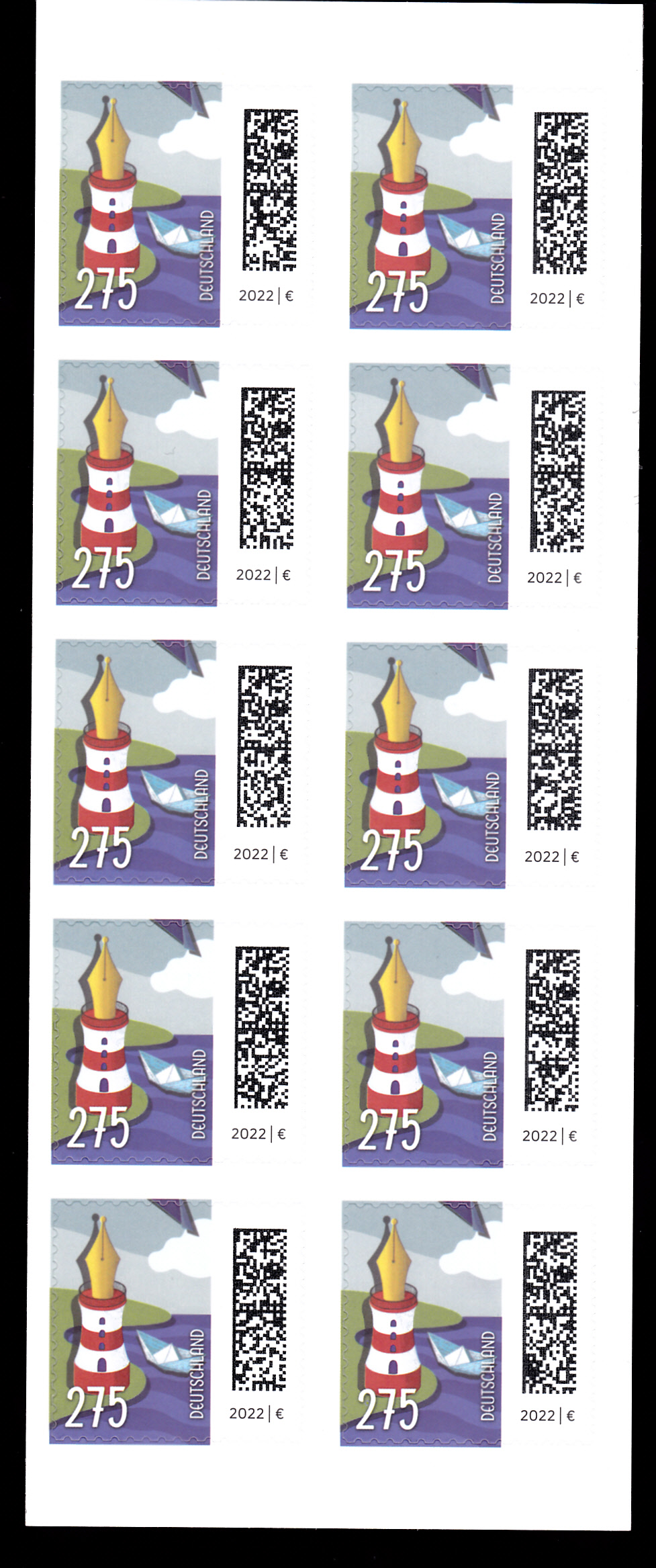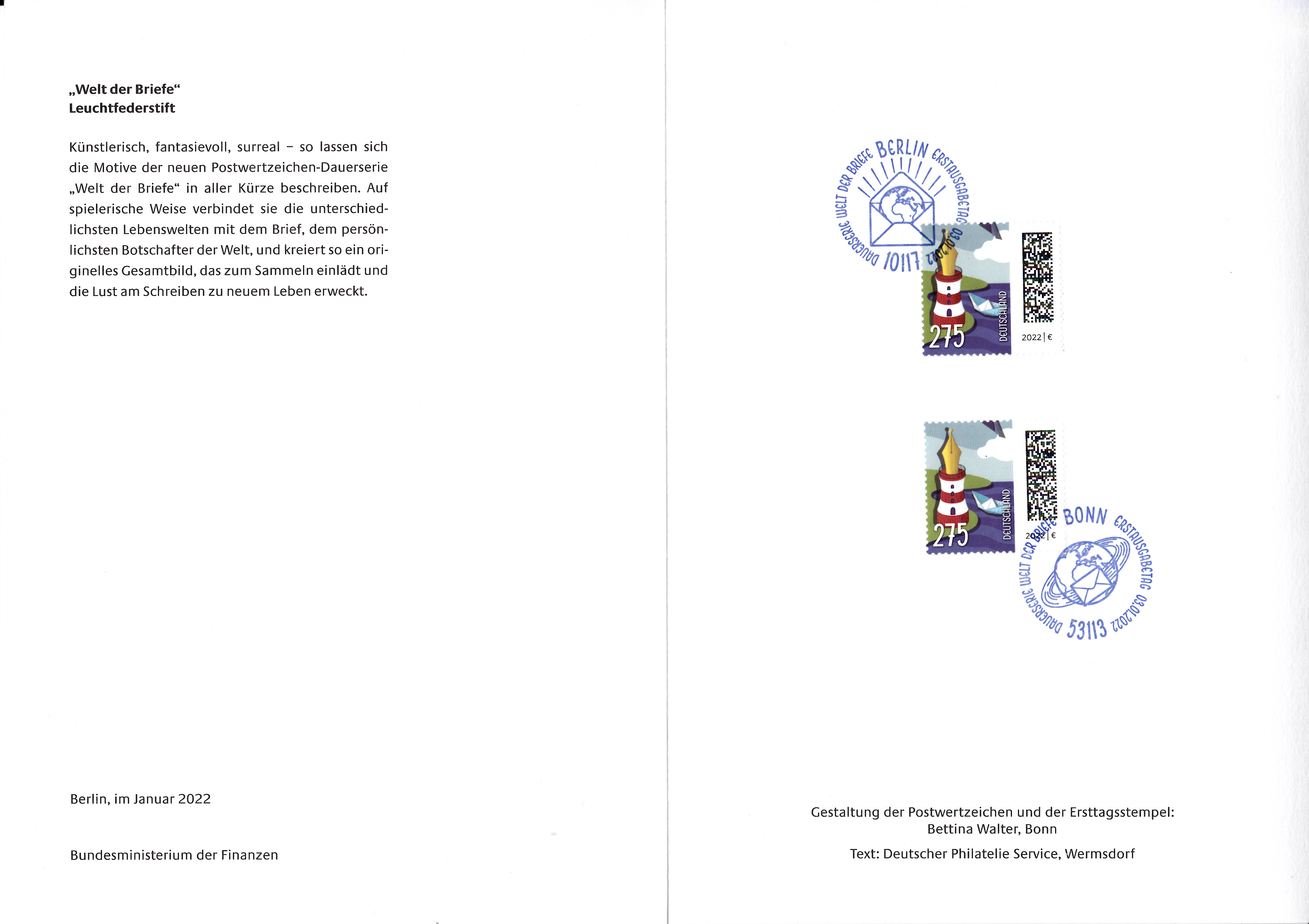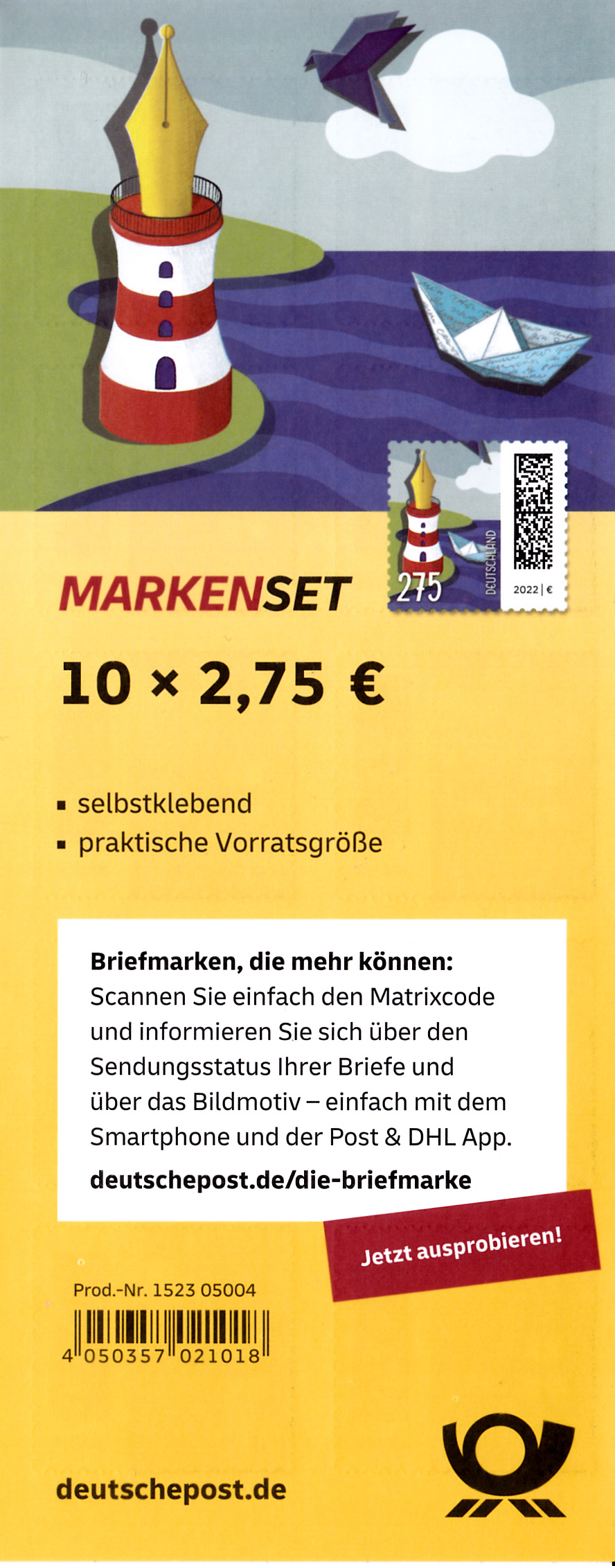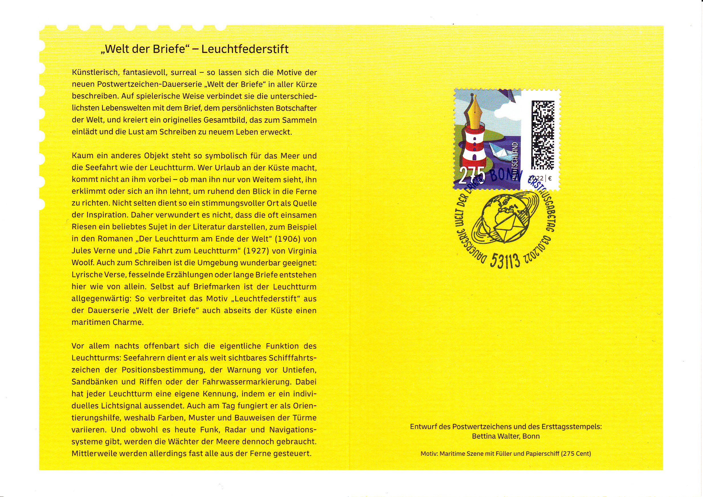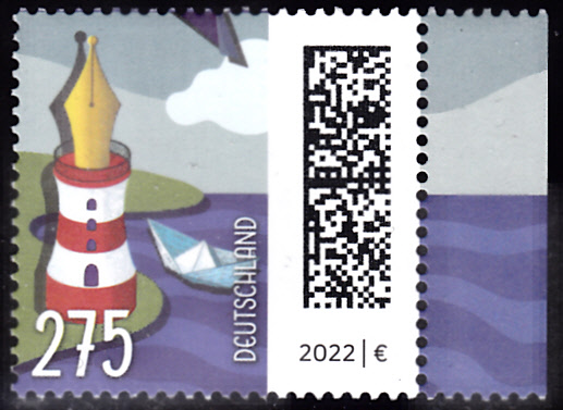 Am 3.2.2022 ist die selbstklebende Marke zu 275 Cent (MiNr 3657) aus der Dauerserie "Welt der Briefe" in einem Folienblatt und als Einzelmarke aus Folienbogen erschienen. Sie zeigt einen "Füllfederhalter als Leuchtturm" und ein "Papierschiff".