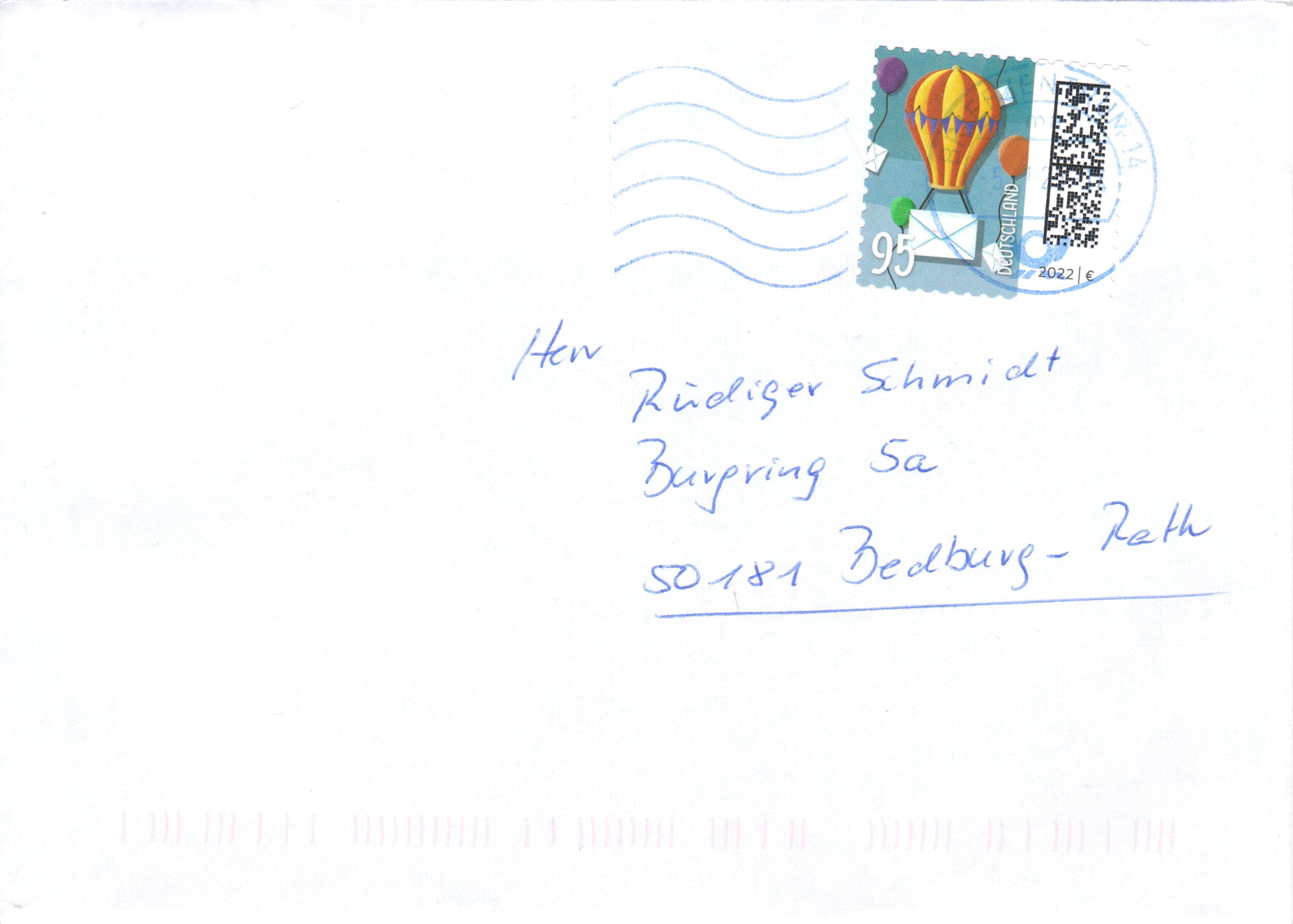 Am 4.8.2022 ist die nassklebende Marke zu 95 Cent (MiNr 3804) aus der Dauerserie "Welt der Briefe" erschienen. Sie zeigt "Ballons mit Briefen als Korb".