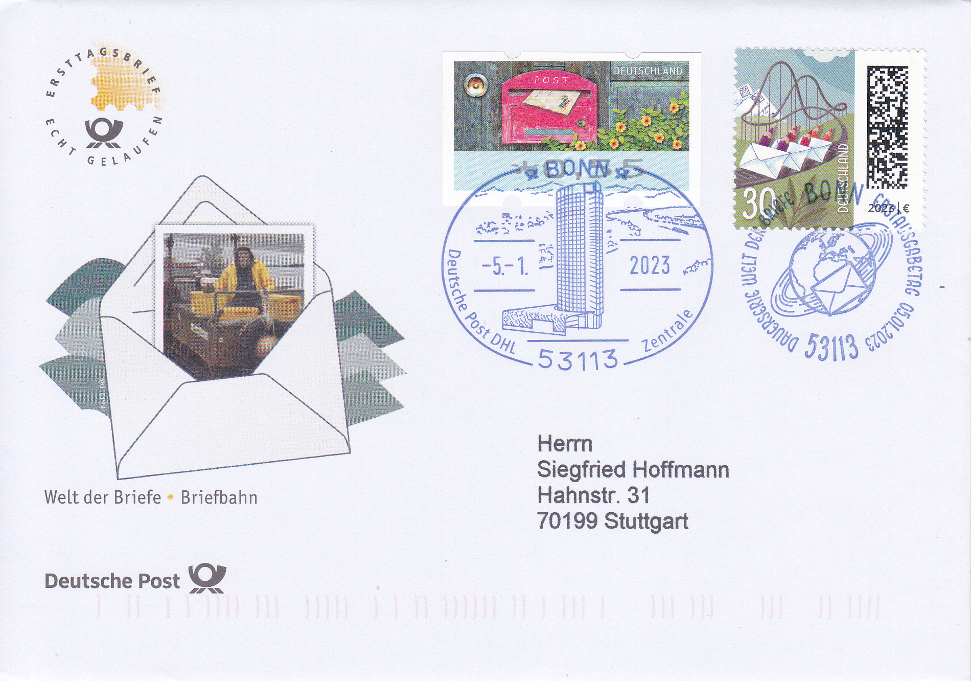 Ersttagsbrief der Deutschen Post (wurde im Abo bei der Post bezogen) mit einer nassklebenden Marke zu 30 Cent mit dem Ersttagstempel Bonn und der Zusatzfrankatur einer Automatenmarke zu 55 Cent mit einem Stempel der Deutschen Post DHL Zentrale in Bonn.
