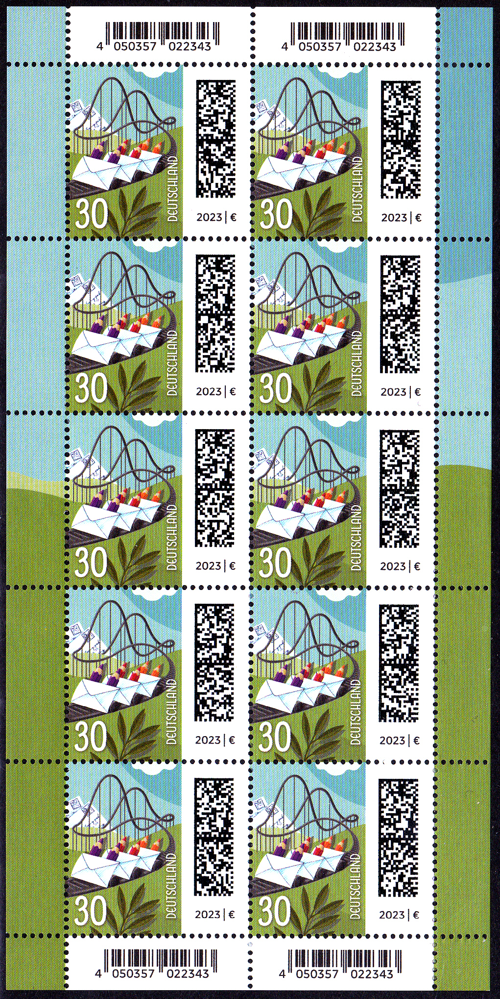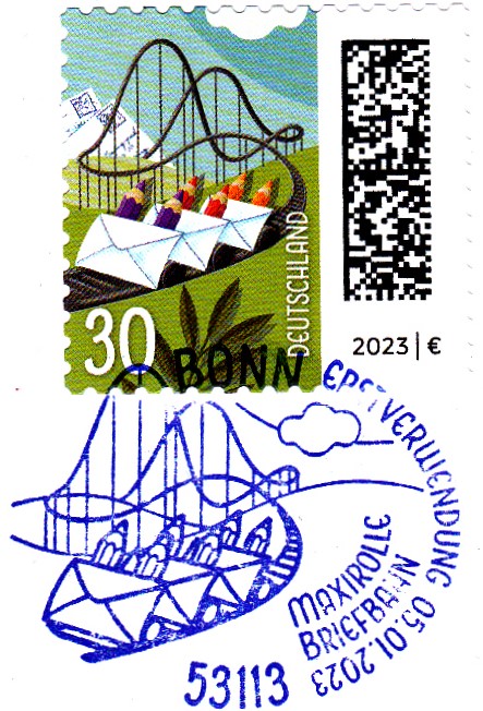 Am 5.1.2023 ist die nassklebende Marke zu 30 Cent (MiNr 3732) aus der Dauerserie "Welt der Briefe" erschienen. Sie zeigt die Abbildung "Briefe und Stifte in Berg- und Talbahn".