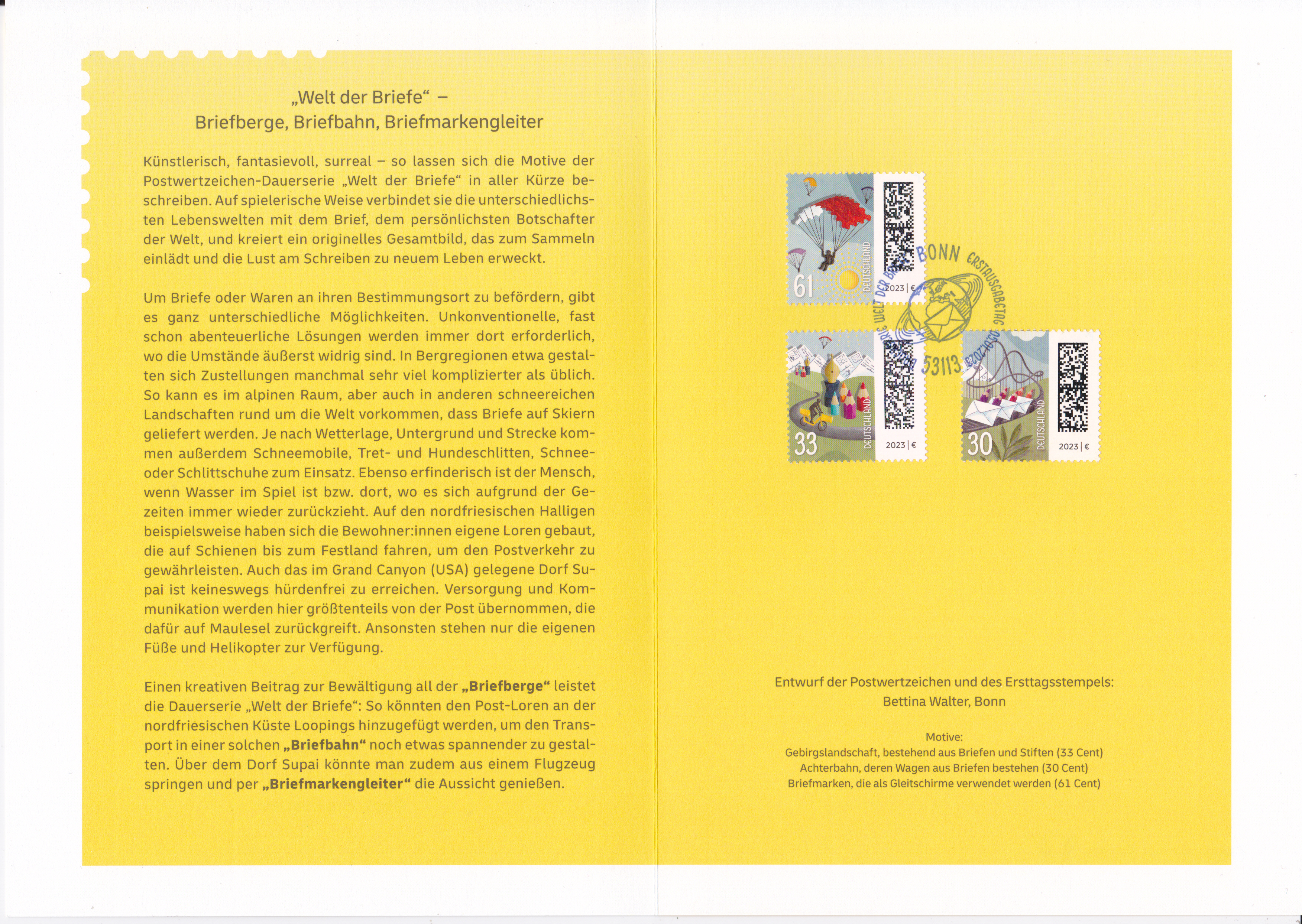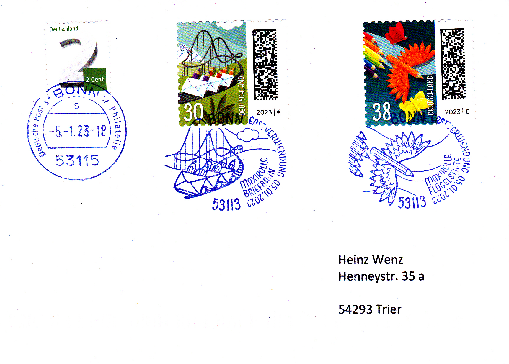 Ebenfalls am 5.1.2023 ist die selbstklebende Marke zu 30 Cent (MiNr 3740) aus der Dauerserie "Welt der Briefe" erschienen.