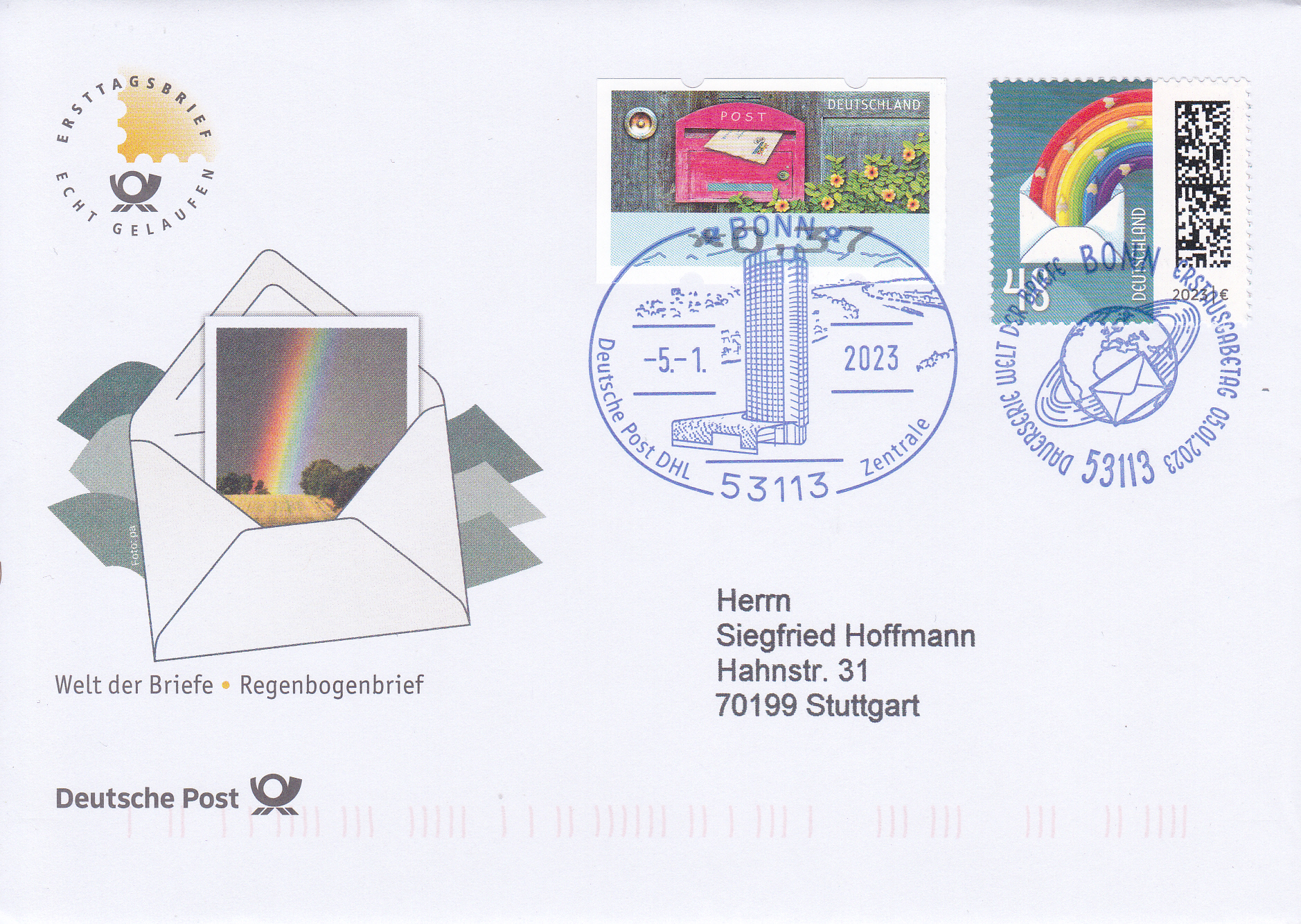 Ersttagsbrief der Deutschen Post (wurde im Abo bei der Post bezogen) mit einer nassklebenden Marke zu 48 Cent mit dem Ersttagstempel Bonn und der Zusatzfrankatur einer Automatenmarke zu 37 Cent mit einem Stempel der Deutschen Post DHL Zentrale in Bonn.