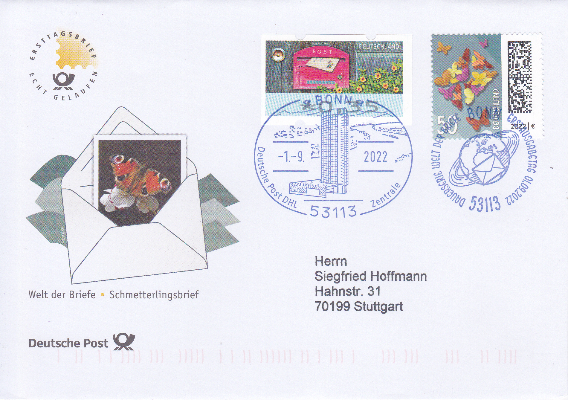 Ersttagsbrief der Deutschen Post (wurde im Abo bei der Post bezogen) mit einer nassklebenden Marke zu 50 Cent mit dem Ersttagstempel Bonn und der Zusatzfrankatur einer Automatenmarke zu 35 Cent mit einem Stempel der Deutschen Post DHL Zentrale in Bonn.