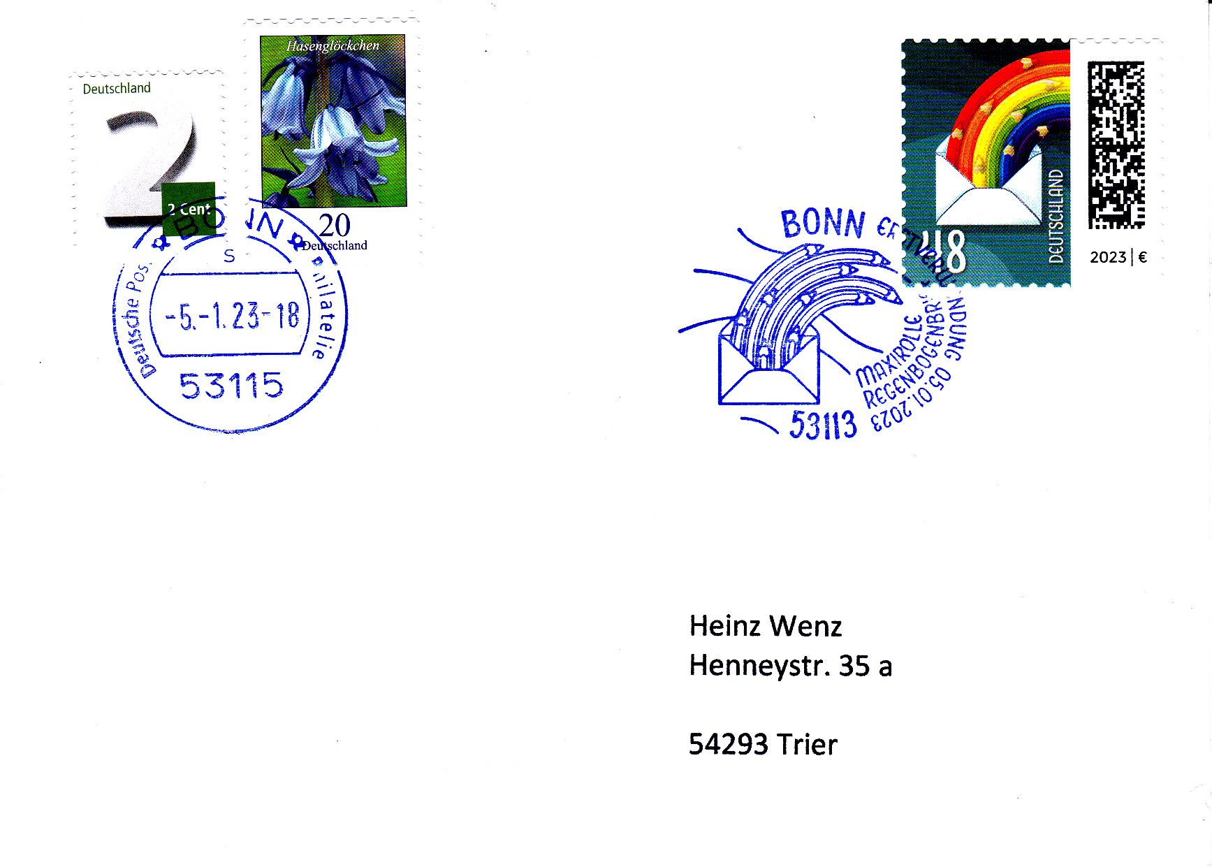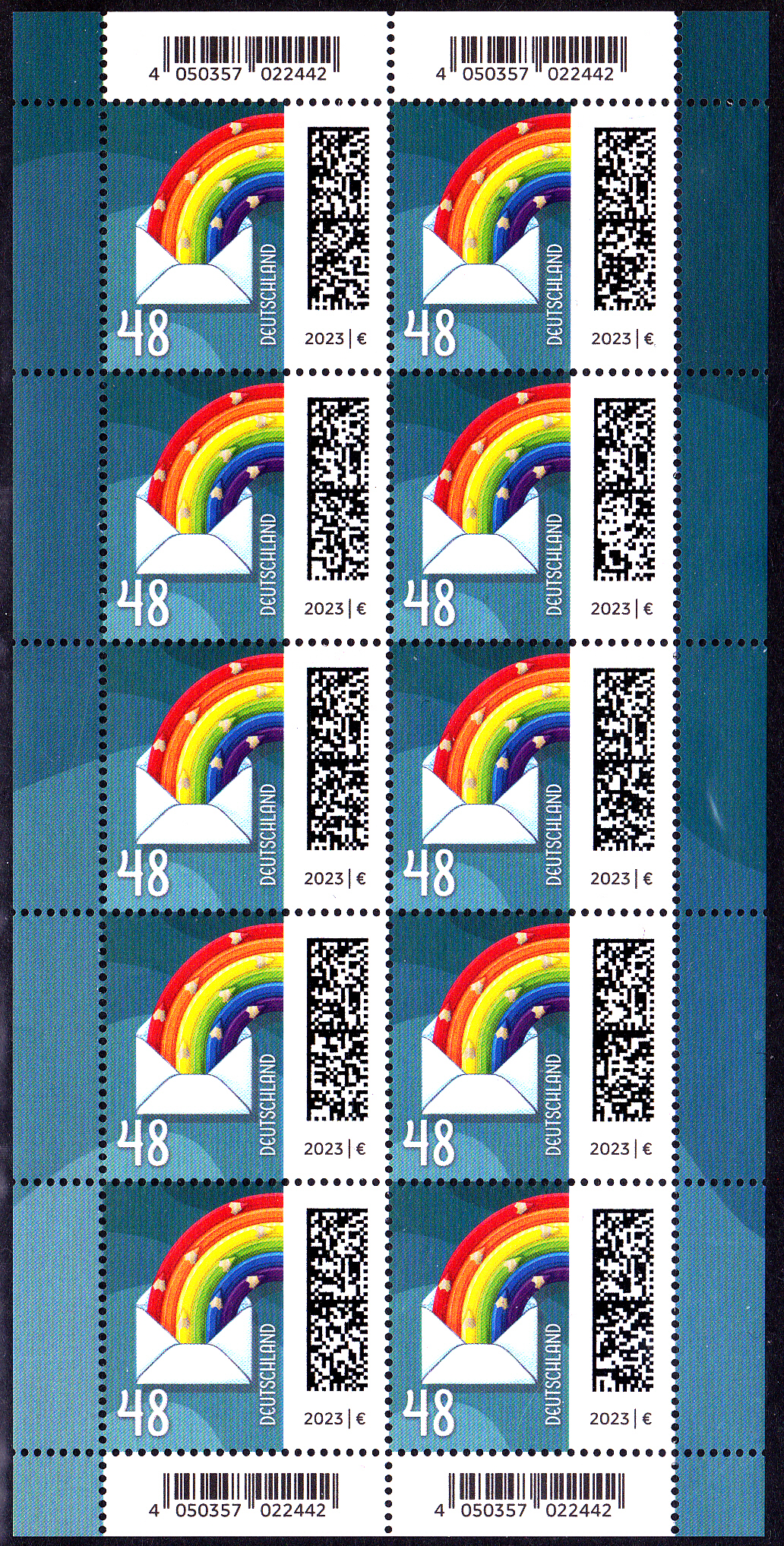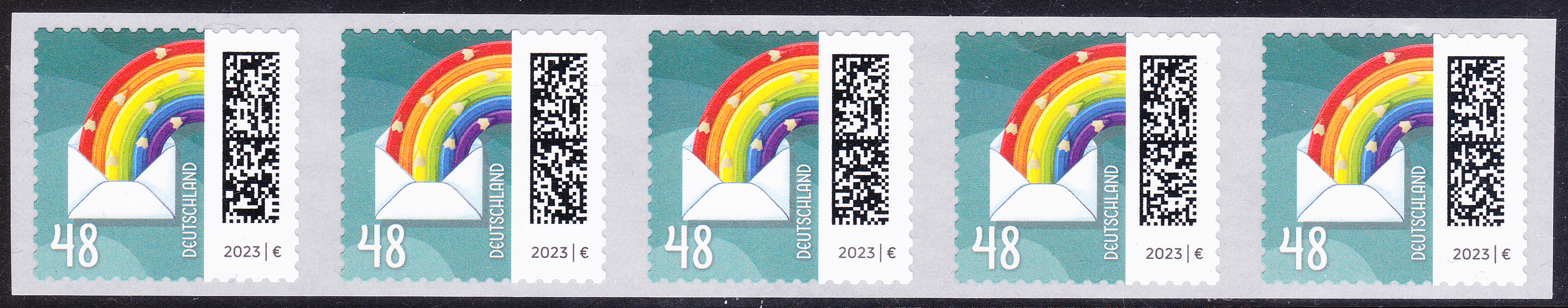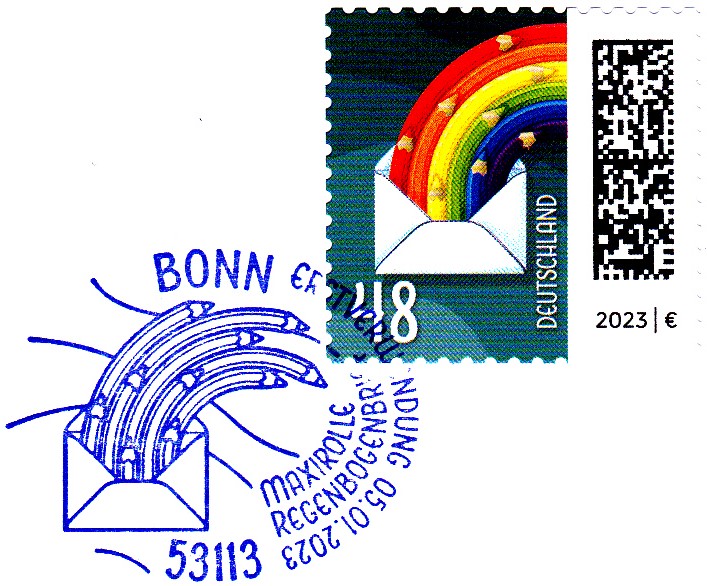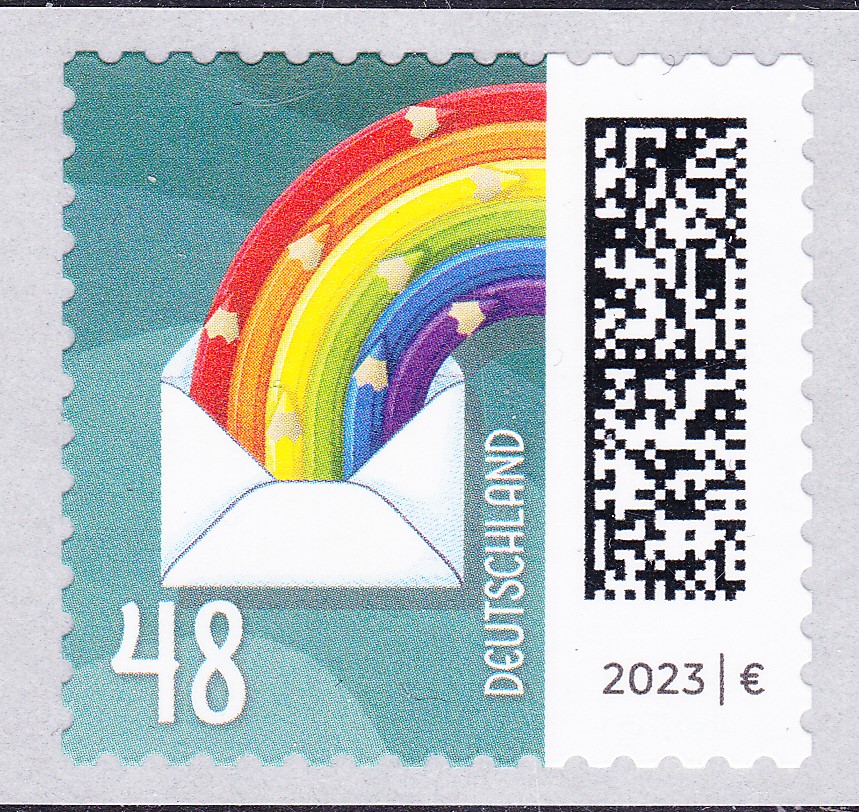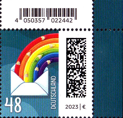 Am 5.1.2023 ist die nassklebende Marke zu 38 Cent (MiNr 3735) aus der Dauerserie "Welt der Briefe" erschienen. Sie zeigt die Abbildung "Briefcouvert entsendet Regenbogenstifte". Hier zeige ich ein Eckrandstück mit EAN-Codierung.