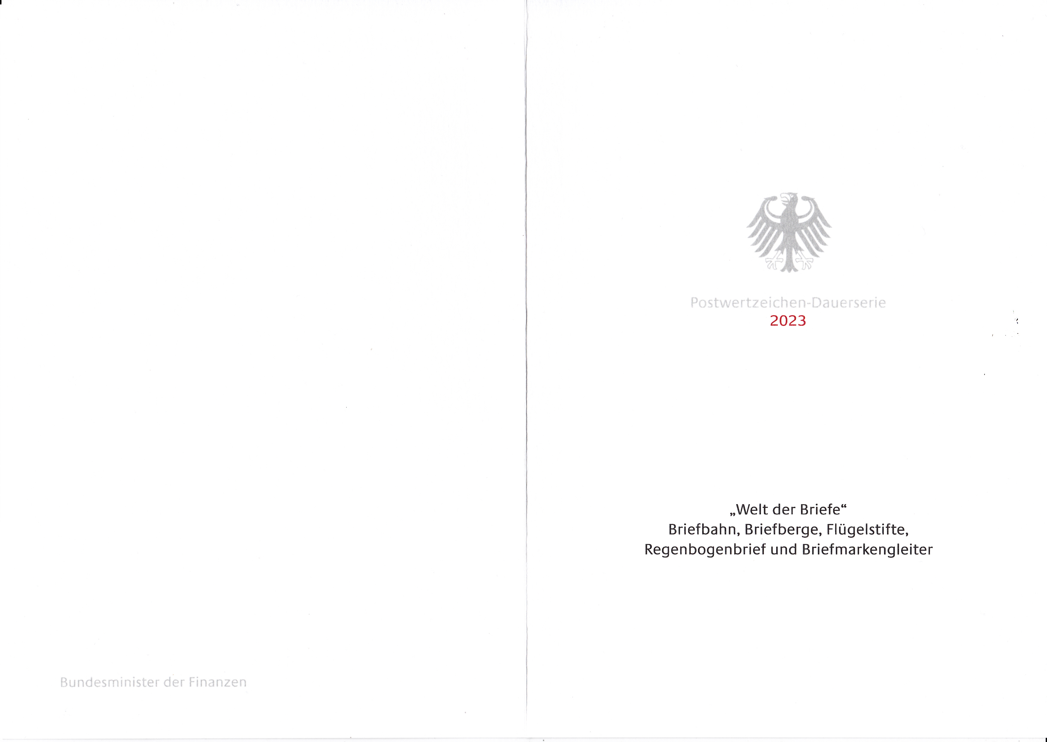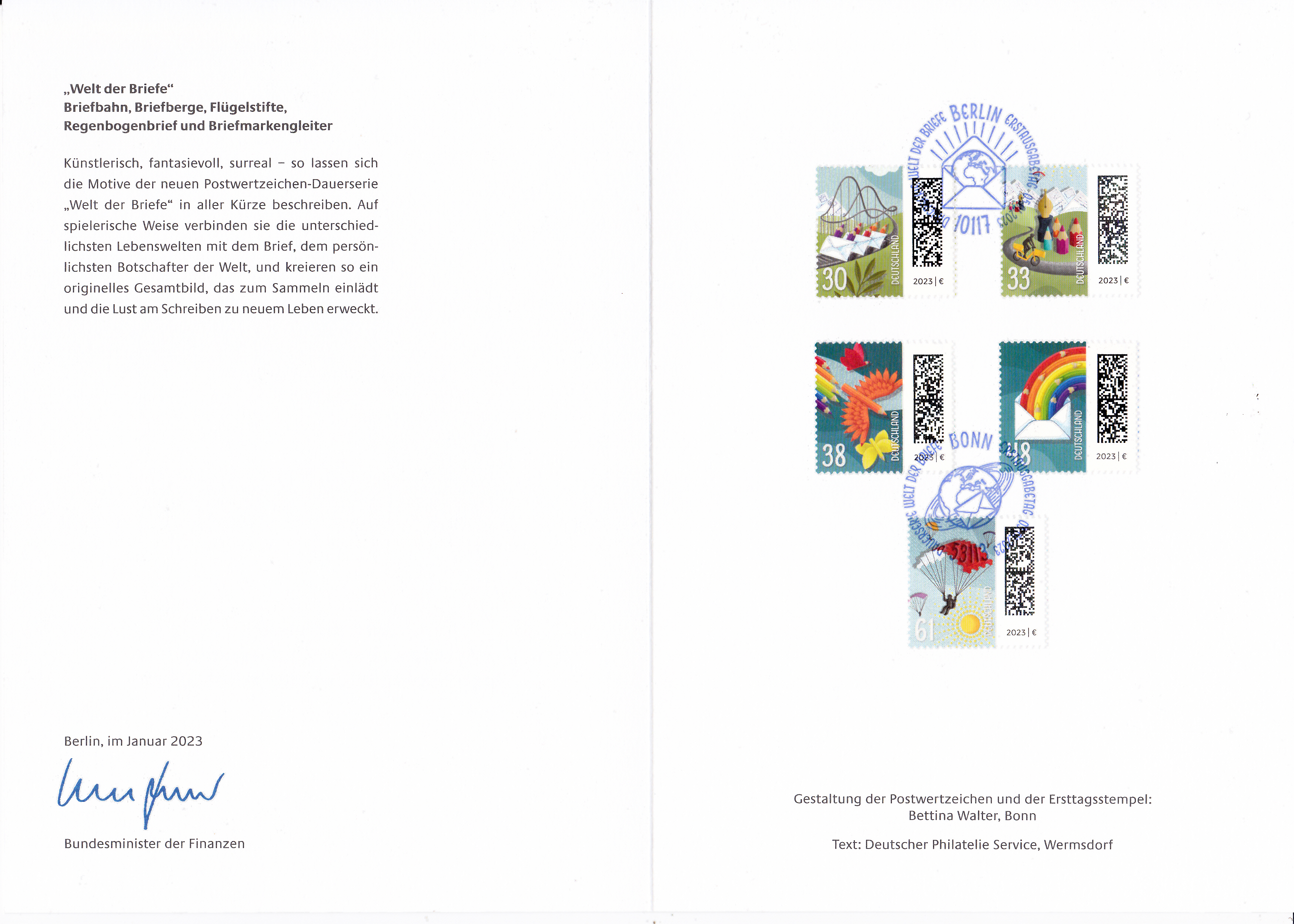 Ministerkarte des Bundesministers für Finanzen mit je einer Marke zu 30 Cent, 33 Cent, 38 Cent, 48 Cent und 61 Cent (MiNr 3732 bis 3736) aus der Freimarkenserie "Welt der Briefe" und den beiden Ersttagsonderstempel Bonn und Berlin.