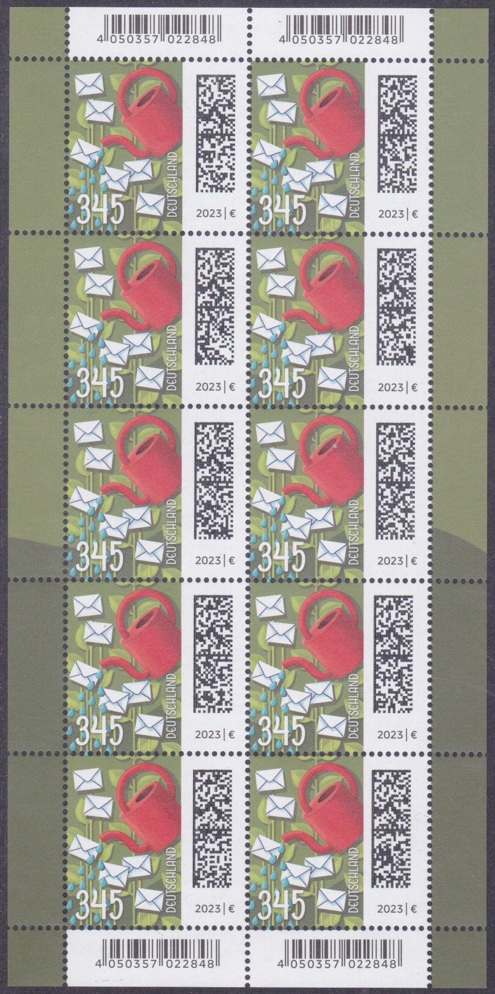 Am 3. August 2023 ist eine Marke zu 345 Cent mit dem Motiv "Rote Gießkanne bewässert Briefblumen" erschienen.