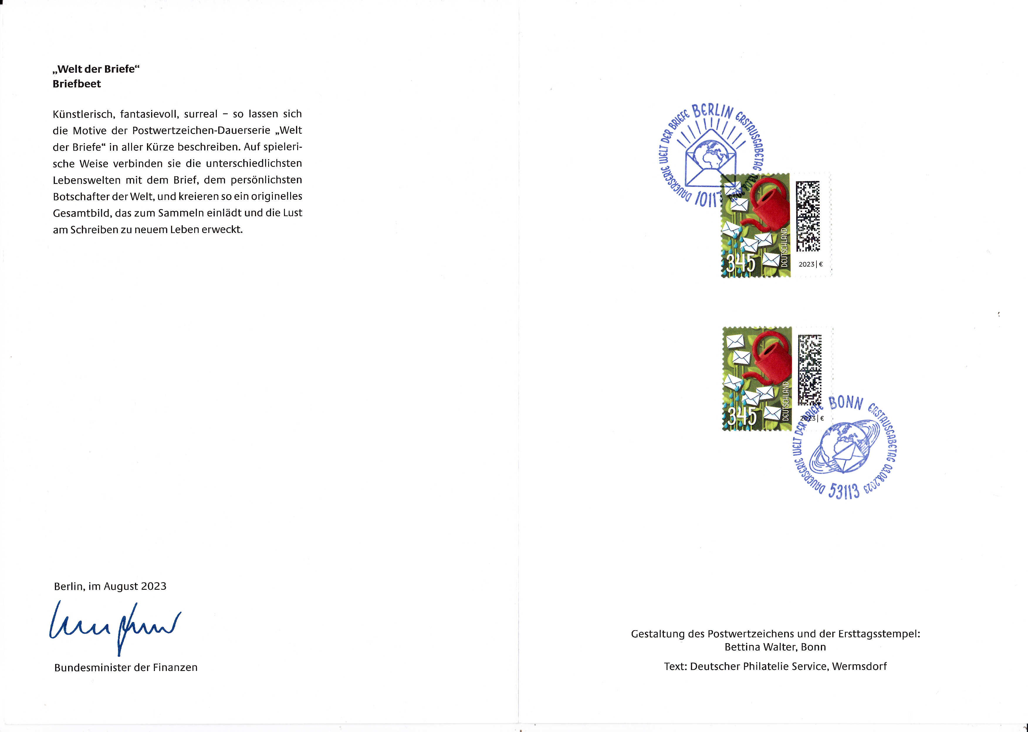 Ministerkarte des Bundesministers für Finanzen mit zwei Marken (MiNr 3776) zu 345 Cent mit dem Motiv "Rote Gießkanne bewässert Briefblumen" aus der Serie "Welt der Briefe" und den beiden Ersttagsonderstempel Bonn und Berlin.