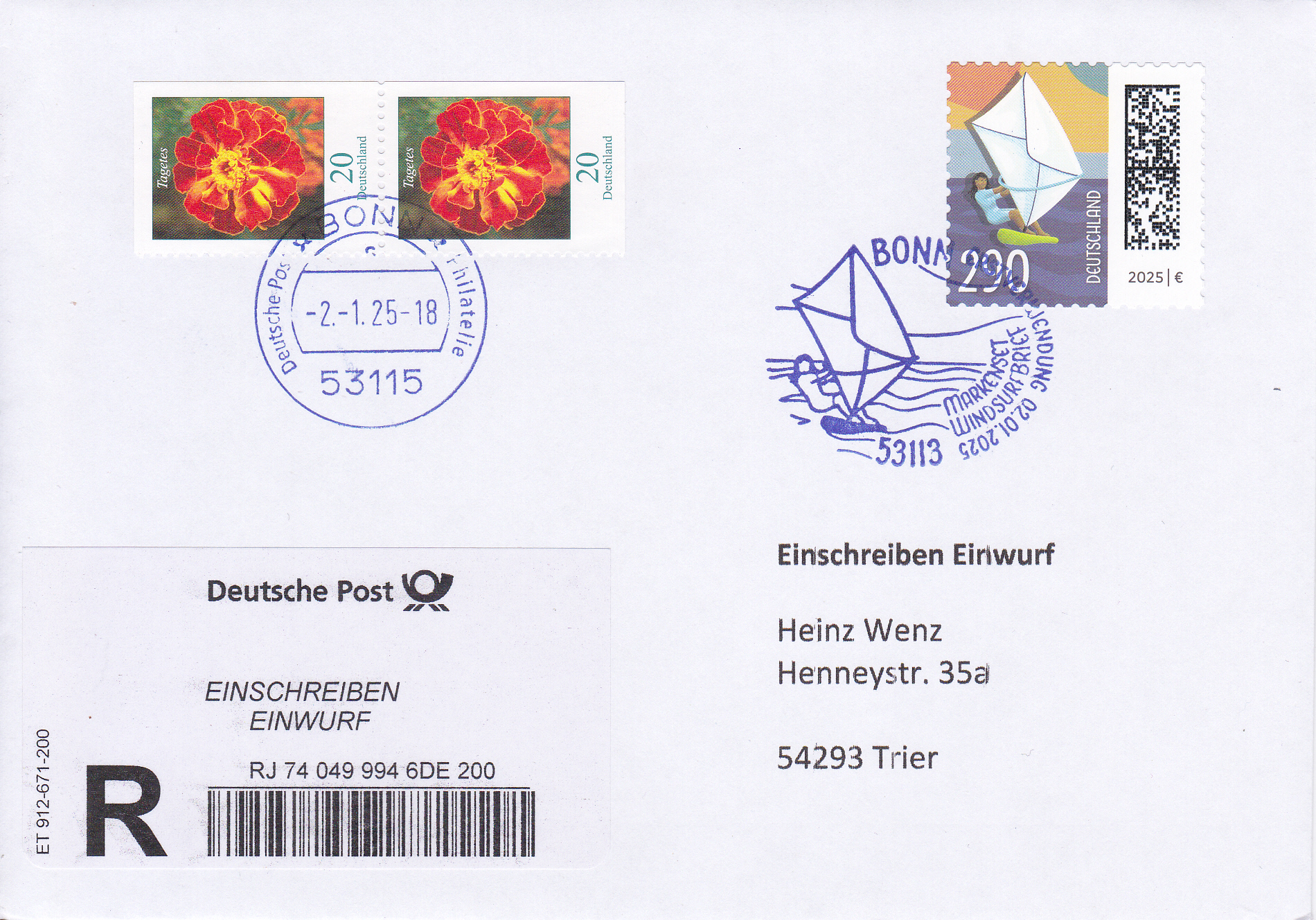 Brief als Einschreiben Einwurf mit einer selbstklebenden Marke zu 290 Cent mit dem Erstverwendungsstempel und zwei Marken zu 20 Cent aus der Blumenserie (MiNr 2471Eo/Eu) mit einem Tagesstempel.