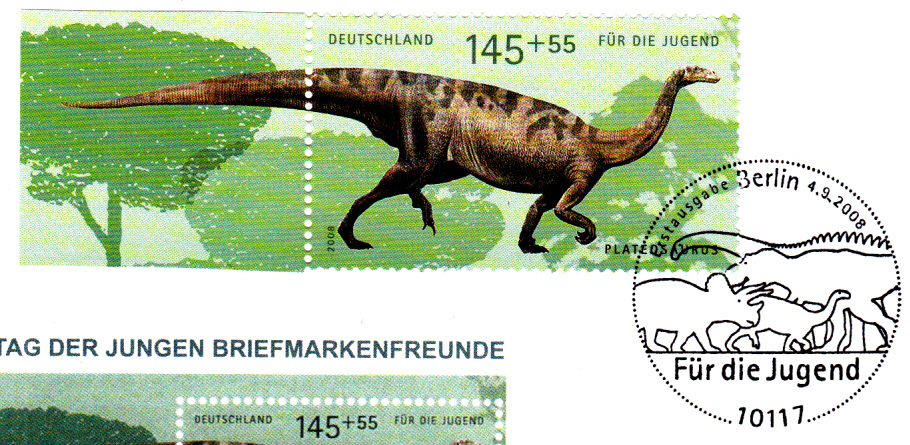 Der Apatosaurus („trügerische Echse“), er wird auch Brontosaurus („Donnerechse“) genannt, ist eine Gattung sauropoder Dinosaurier, aus der Familie Diplodocidae. Sie zählt zu den bekanntesten Dinosauriern. Apatosaurus lebte im Oberjura, seine Fossilien wurden in den westlichen USA (Colorado, Oklahoma, Wyoming und Utah) gefunden. Er erreichte eine Länge von 21 bis 26 Metern und sein Gewicht wird auf 30 bis 35 Tonnen geschätzt. Er war kräftig gebaut, aber nicht so lang wie der nah verwandte, ähnlich gebaute Diplodocus, der auch auf der bereits gezeigten Blockausgabe mit den Jugendmarken 2008 zu sehen ist. Er war wie alle Sauropoden ein Pflanzenfresser. Parallel verlaufende, versteinerte Fußspuren zeigen, dass er zumindest zeitweise in Herden lebte.