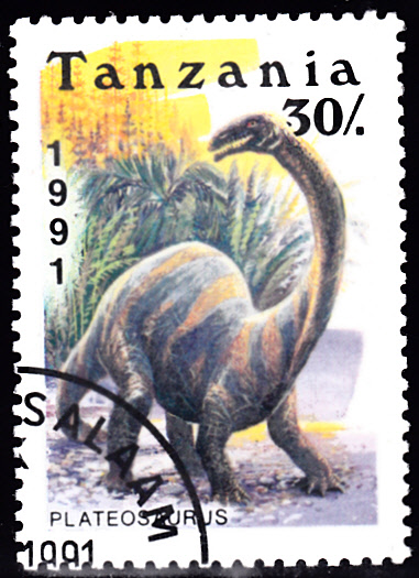Eine weitere Marke dieser Serie aus Tansania (MiNr 857) bildet einen Plateosaurus ab. Im Michel fehlt beim Namen ein "e" (Platosaurus).