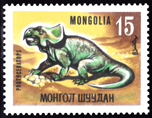 Aus der gleiche Serie aus der Mongolei kommt diese Marke (MiNr 462) mit einem Protoceratops.