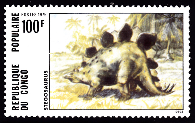 Auf der vierten und letzten Marke aus der Serie aus dem Kongo-Brazzaville (MiNr 495) sehen wir einen weiteren Stegosaurus.