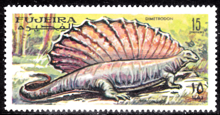 In einer Serie "Prähistorische Tiere" aus Fujeira gibt es auch zwei motivgleiche Marken mit einem Dimetrodon.