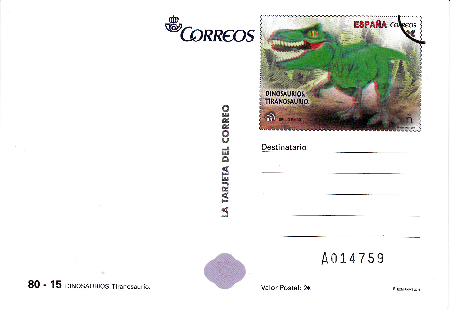 In Spanien ist eine Ganzsachen-Postkarte mit dem Wertstempel im Muster der Marke MiNr 4976 mit der Abbildung eines Tyrannosaurus erschienen. Hier zeige ich eine "Musterkarte".
