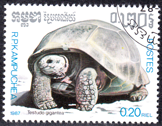 Auf dieser Marke aus Kambodscha (MiNr 883) wird eine Aldabra-Riesenschildkröte (Aldabrachelys gigantea) gezeigt.
