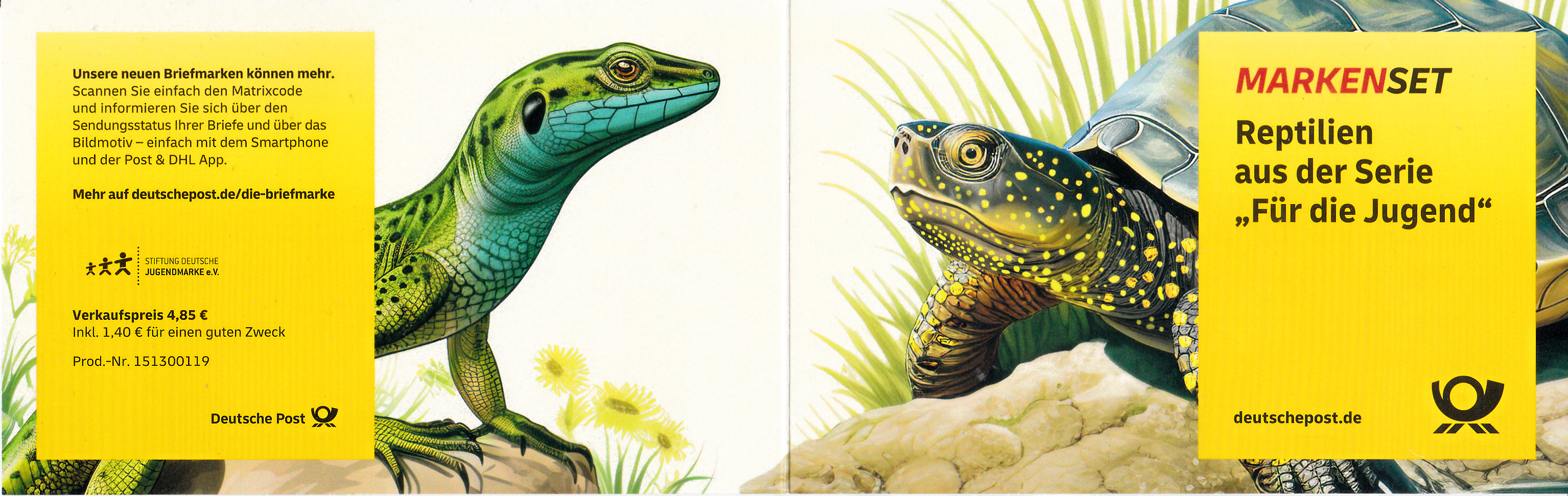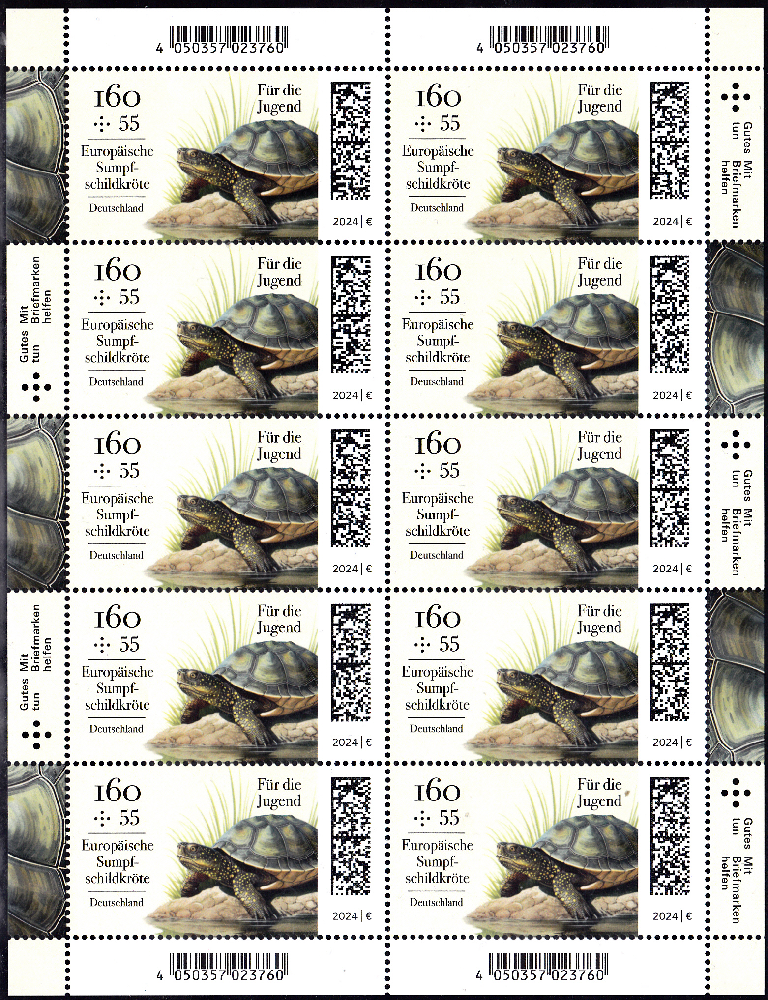 Die Jugendmarke 2024 zu 160+55 Cent (MiNr 3845) zeigt eine Europäische Sumpfschildkröte (Emys orbicularis).