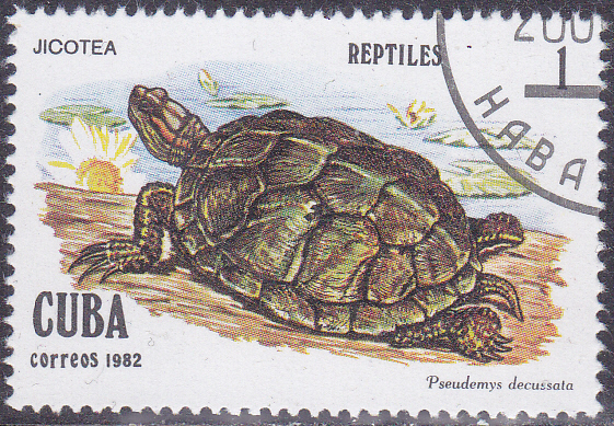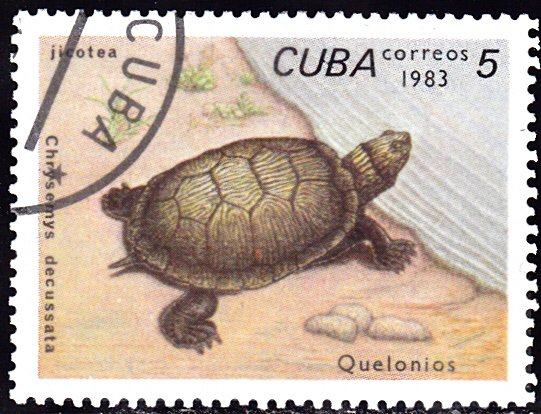 Auf einer Marke aus Kuba (MiNr 2667) wird eine Kuba-Schmuckschildkröte (Trachemys decussata) gezeigt.