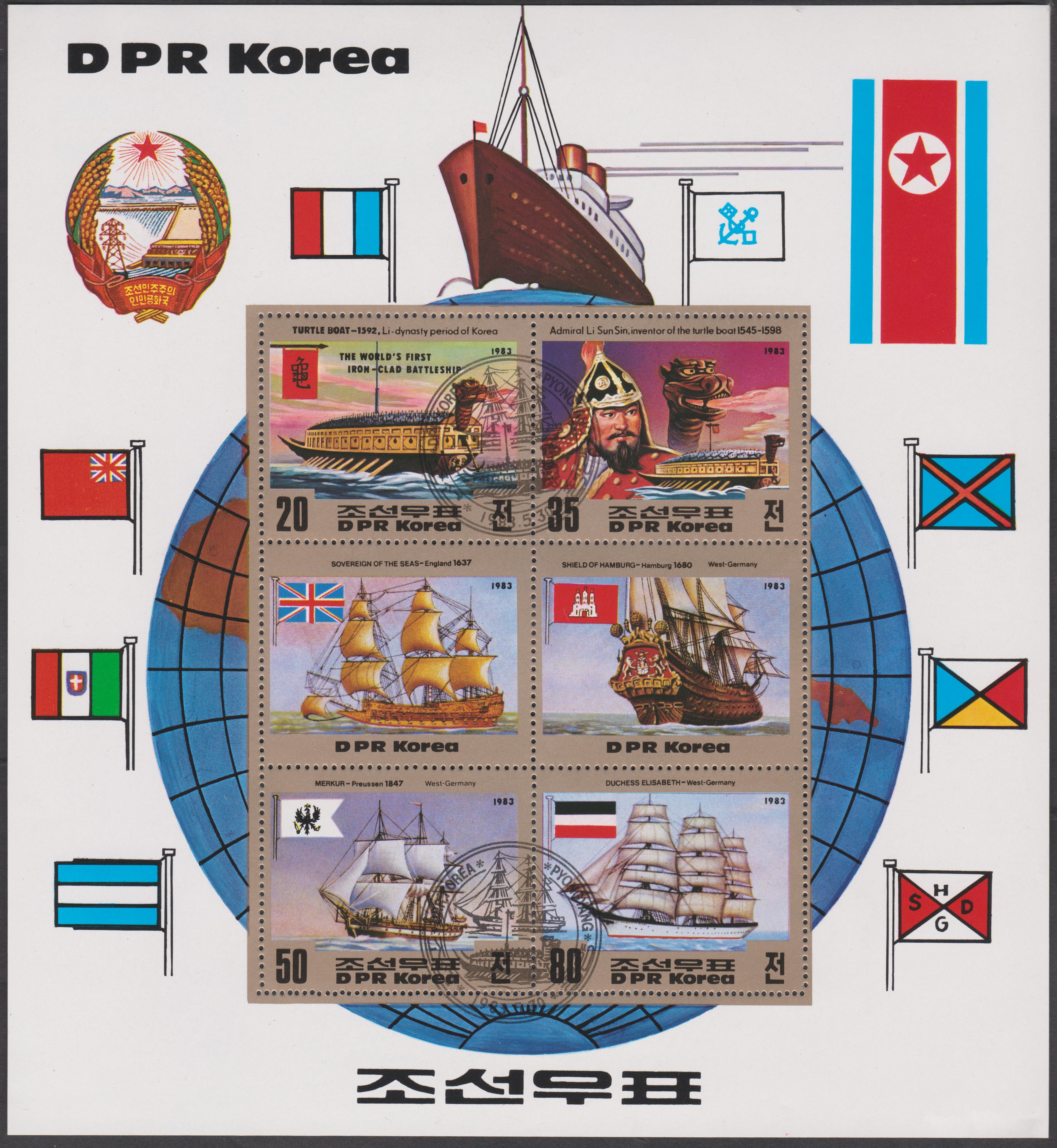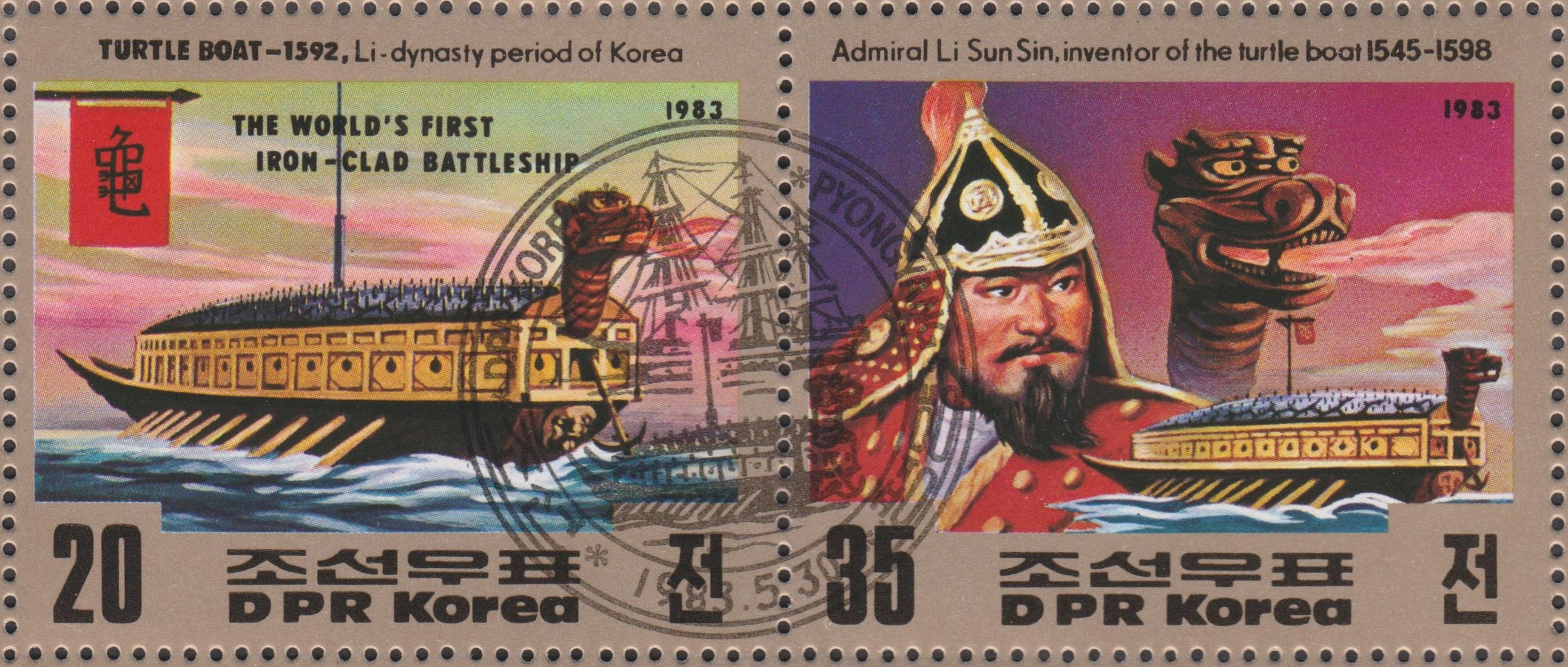 Die beiden oberen Marken in diesem Block, Nordkorea Block 145 A mit MiNr. 2367 - 2370, zeigen ein Schildkrötenboot = TURTLE BOAT:
