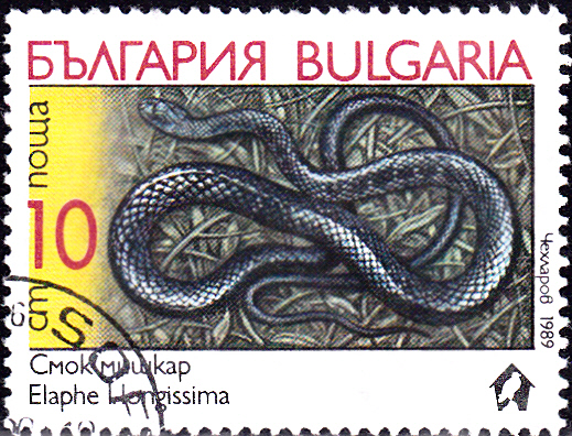 Auf einer Marke aus Bulgarien (MiNr 3785) wird eine Äskulapnatter (Zamenis longissimus) gezeigt.