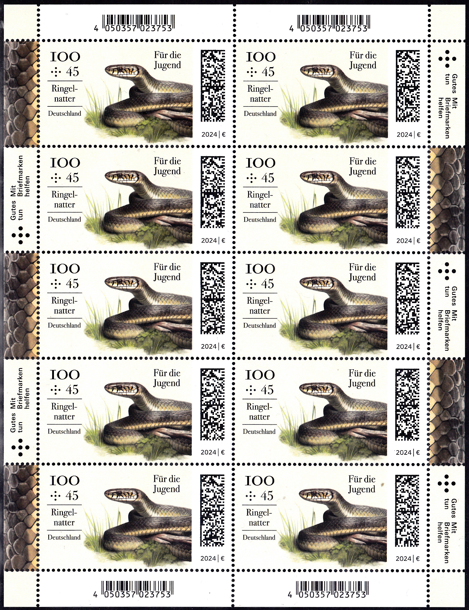 Die Jugendmarke 2024 zu 100+45 Cent (MiNr 3845) zeigt eine Ringelnatter (Natrix natrix).