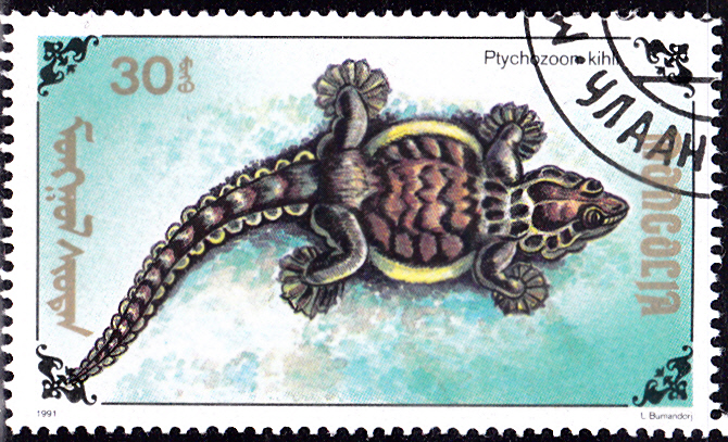 Eine Marke aus de Mongolei (MiNr 2286) bildet Kuhls Faltengecko (Gekko kuhli; Syn.: Ptychozoon kuhli; Lacerta homalocephala; Platydactylus homalocephalus) ab.