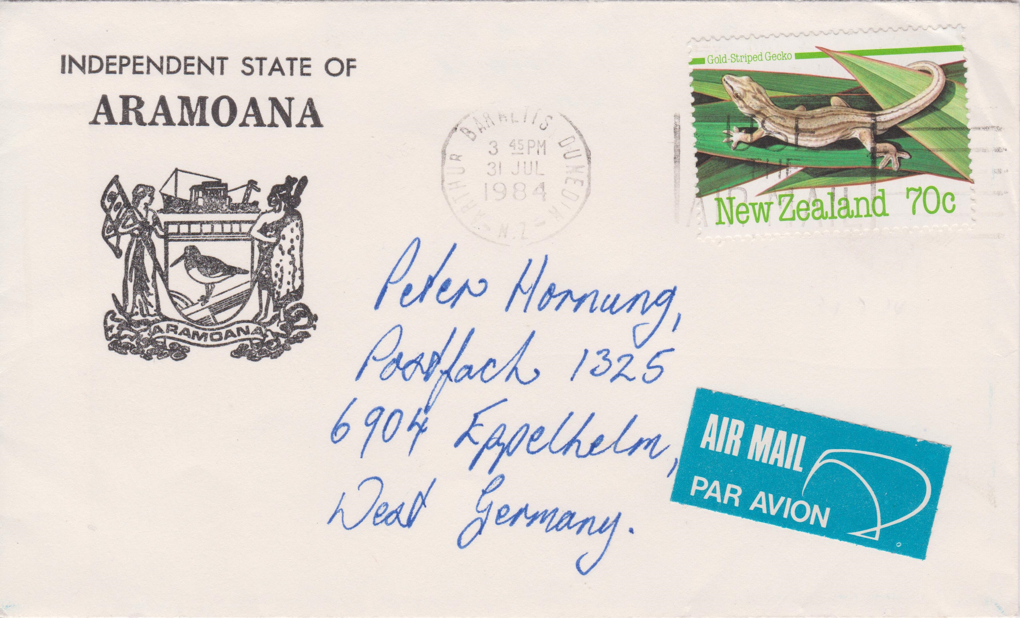 Einzelfrankatur eines Postwertzeichens aus Neuseland mit dem Motiv "Gold-Striped Gecko" auf Luftpostbrief nach Deutschland: