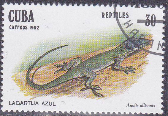 Aus Kuba kommt auch eine Marke (MiNr 2671) bildet eine Blaukopfanolis (Anolis allisoni) ab.