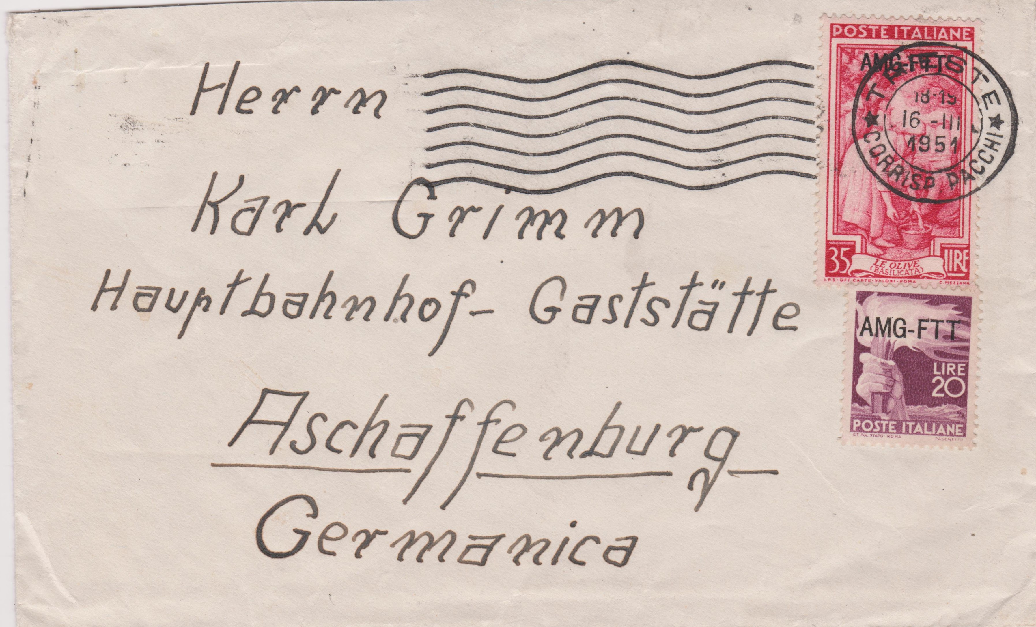 Triest - Zone A MiNr. 131 = Italien MiNr. 818 als Mischfrankatur mit Triest - Zone A MiNr. 88 = Italien MiNr. 700 am 16.03.1951 auf Brief nach Aschaffenburg: