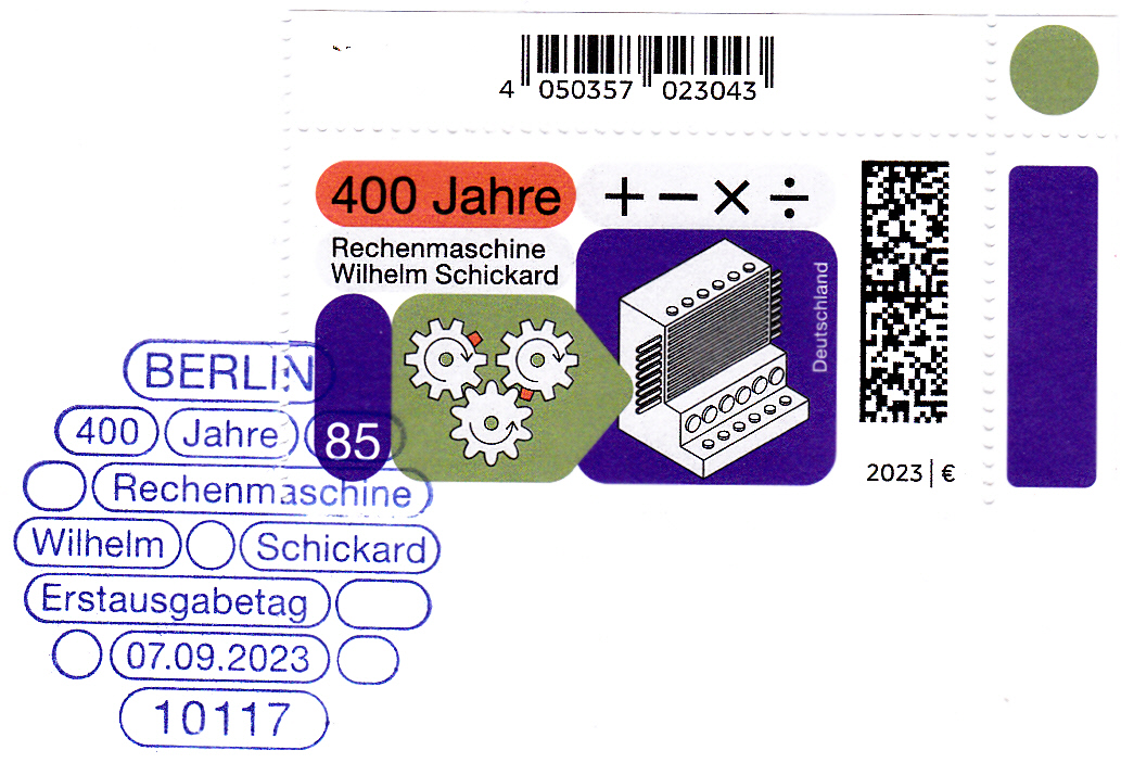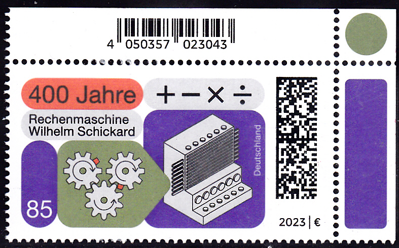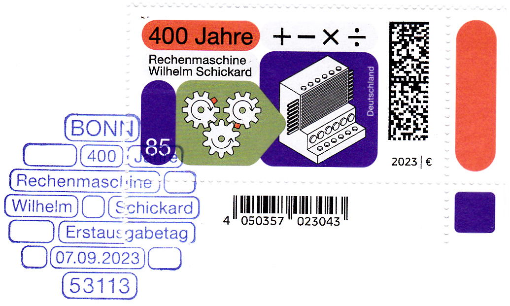 Bei der Deutschen Post erschien zur Erfindung der ersten mechanischen Rechenmaschine durch Wilhelm Schickard vor 400 Jahren diese Marke (MiNr 3786) mit Rechenzeichen, Zahnrädern und einem Bild der Rechenmaschine von Wilhelm Schickard.
