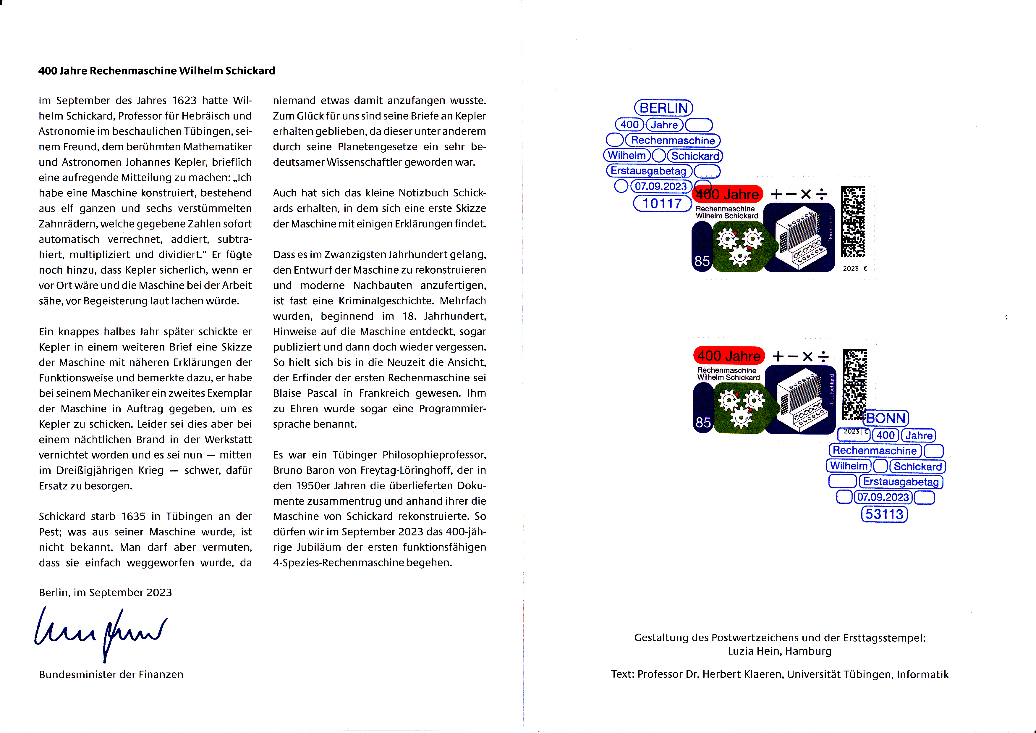 Ministerkarte des Bundesministers für Finanzen mit zwei Marken (MiNr 3786) zur Erfindung der ersten mechanischen Rechenmaschine durch Wilhelm Schickard vor 400 Jahren und den beiden Ersttagsonderstempel Bonn und Berlin.