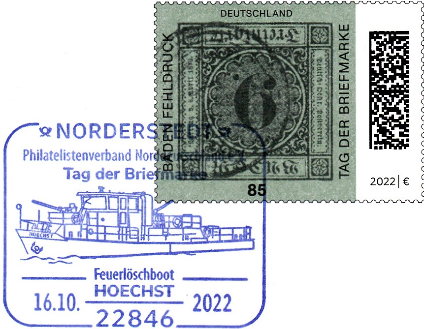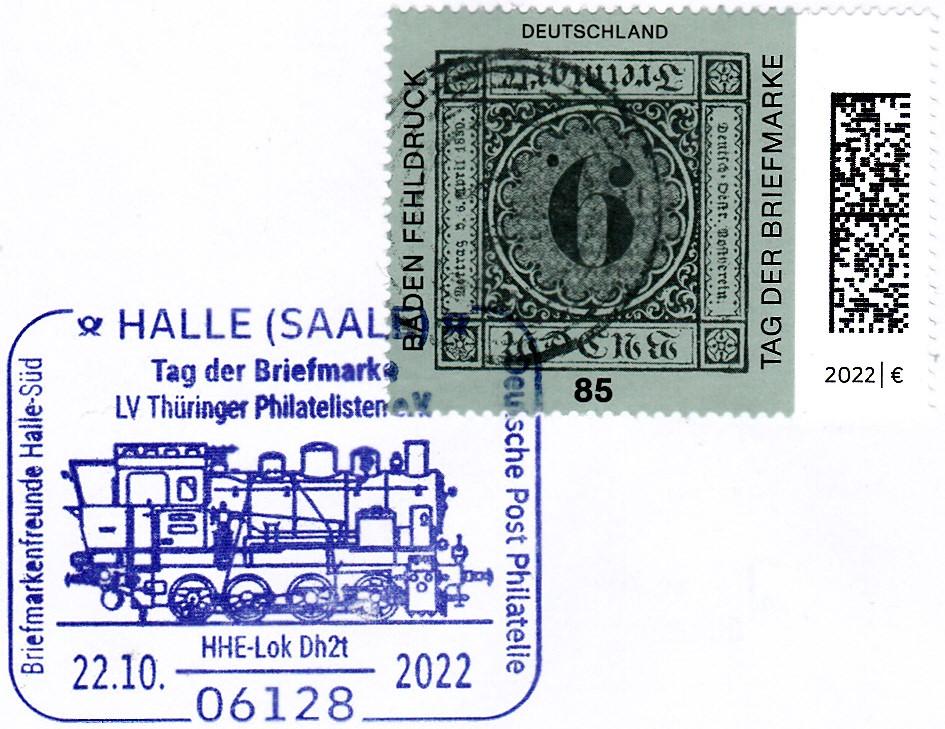 Zum Tag der Briefmarke 2021 ist bei der Deutschen Post eine Marke (MiNr 3719) mit dem Baden-Fehldruck MiNr. 4 F erschienen. Die Marke in schwarz auf blaugrünem statt lilarosa Papier, entwertet mit einem Fünfring-Nummernstempel "41", ist kopfstehend abgebildet.