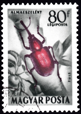Auf einer Marke aus Ungarn (MiNr 1358) wird ein Purpurroter Apfelfruchtstecher (Rhynchites bacchus) vorgestellt. Im Michel heißt er Purpurroter Apfelstecher (Rhynchites bacchus).