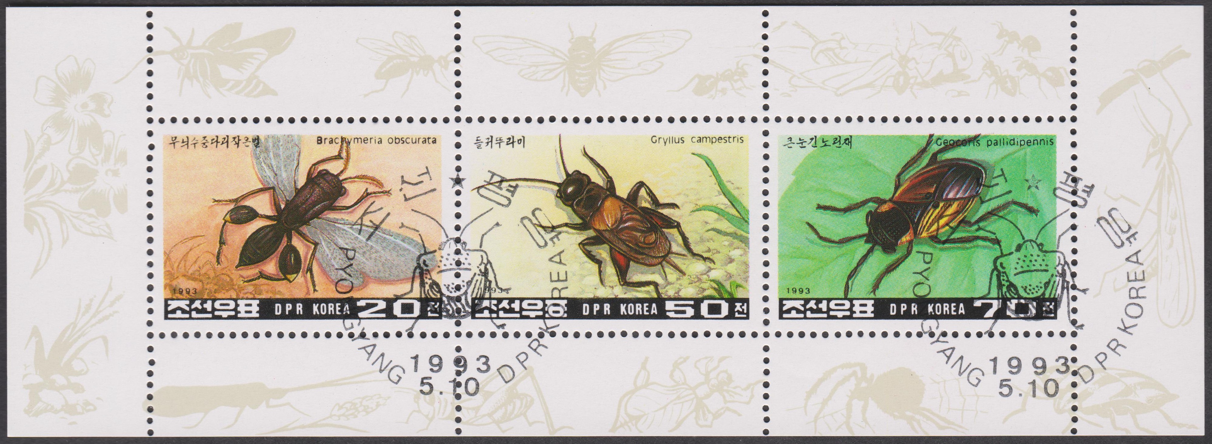 Nordkorea MiNr. 3413 - 3415 zeigen Insekten und wurden waagerecht zusammenhängend im Kleinbogen gedruckt: