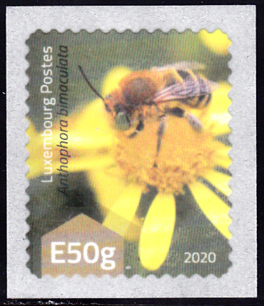 Diese Marke aus Luxemburg (MiNr 2255) zeigt eine Dünen-Pelzbiene (Anthophora bimaculata).