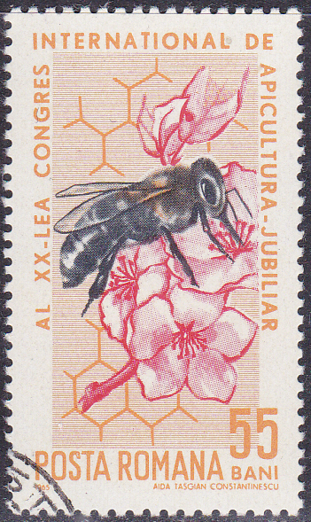 Zum Kongress des Internationalen Verbandes der Bienenzüchtervereinigungen (Kurznamen: Apimondia) ist in Rumänien diese Marke (MiNr 2425) mit einer Westlichen Honigbiene (Apis mellifera) auf Blüten vor Wabenzeichnung erschienen.