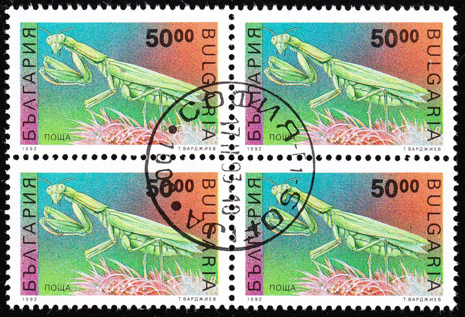 Diese Freimarke Bulgarien MiNr. 4017 zeigt eine Europäische Gottesanbeterin gleich im Viererblock, gestempelt in Sofia am 17.02.1993: